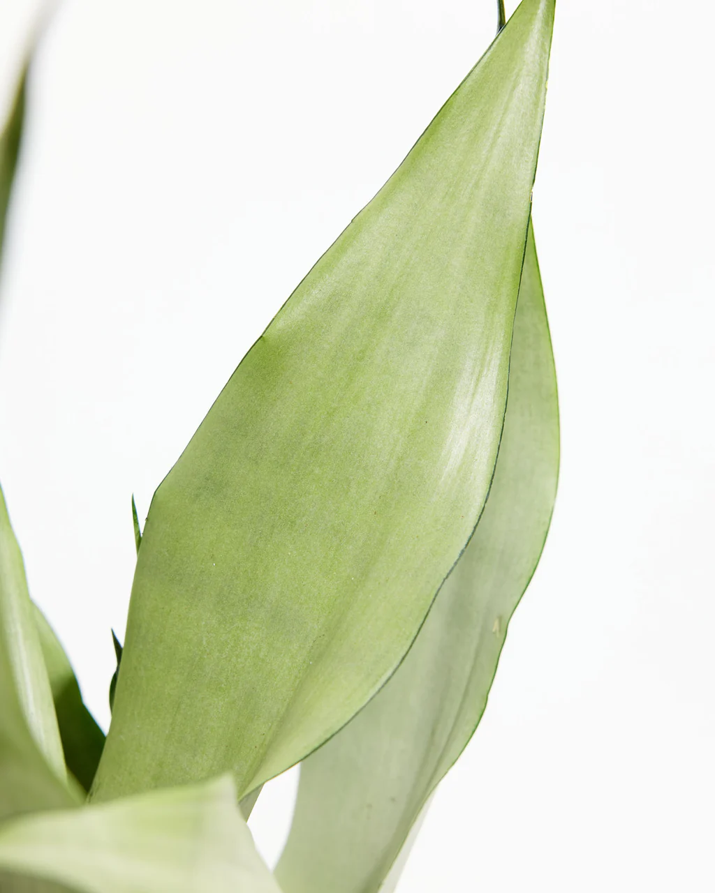 Botanical Characteristics: The Sansevieria Moonshine features broad, thick, succulent leaves that grow vertically, creating a sculptural display. The leaves have a pale, silvery-green hue with subtle green vertical lines. The foliage's matte finish and robust texture add to its visual appeal, making it a standout among indoor plants. Rarely, under the right conditions, it might bloom with white or cream flowers, offering a sweet, pleasant fragrance.