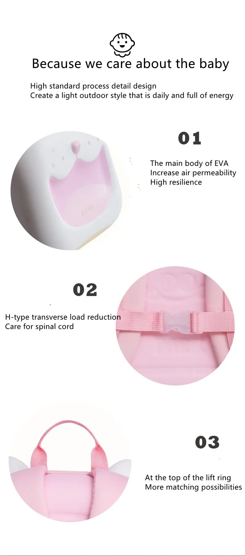 5. Cotton body spine protection design, fits the baby's spine curve, elastic and breathable wide shoulder straps with non-slip buckles to