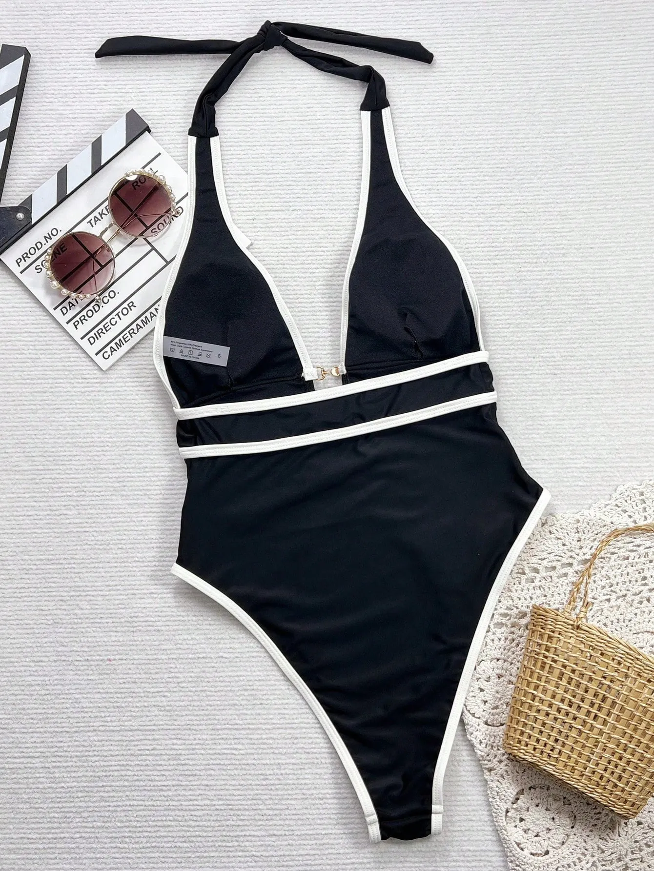 sexy bikini jumpsuit, deep V-neck swimsuit, black and white swimsuit, suspender swimsuit, cross-back bikini, flattering swimsuit design, stylish swimsuit, sexy swimwear for women, trendy swimsuit, unique design swimsuit, beach jumpsuit.