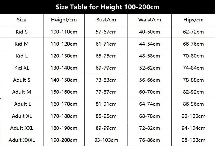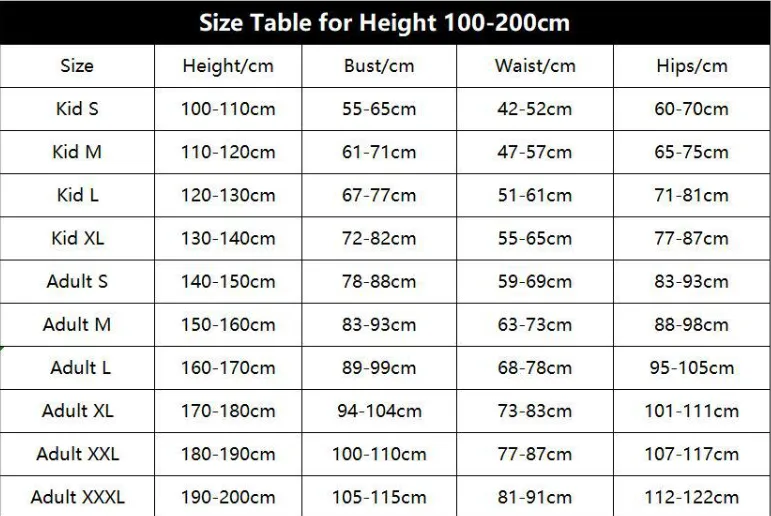 ,Adult-L(160-170),Adult-XL(170-180),Adult-2XL(180-190),Adult-3XL(190-200)