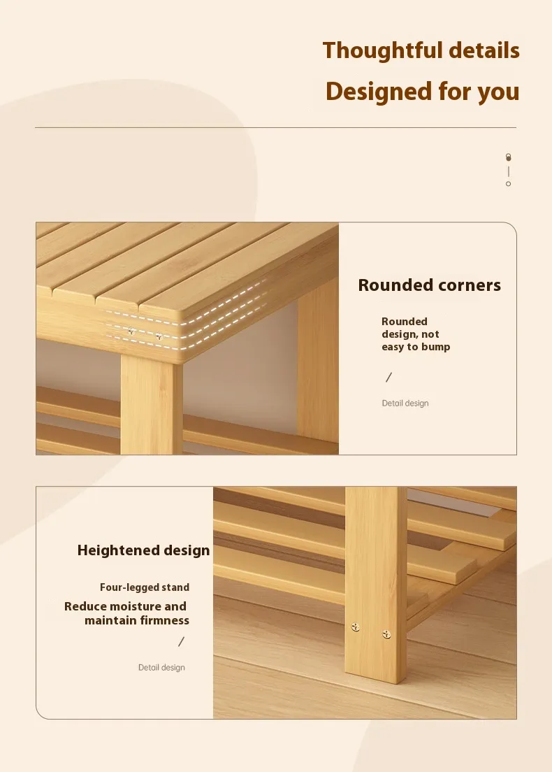 This stool is designed to be sturdy, with the weight of shoes and people distributed evenly across the frame. The durable bamboo material ensures that the bench will hold up under daily use, providing long-lasting service.