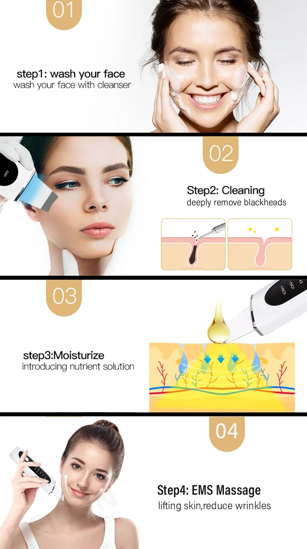 - Blackhead Removal: The ultrasonic vibrations work effectively to break down and remove stubborn blackheads, whiteheads, and clogged pores, giving your skin a clearer, smoother appearance. These high-frequency vibrations penetrate deep into the skin to loosen and eliminate dirt, oil, and impurities, making it ideal for deep cleansing.