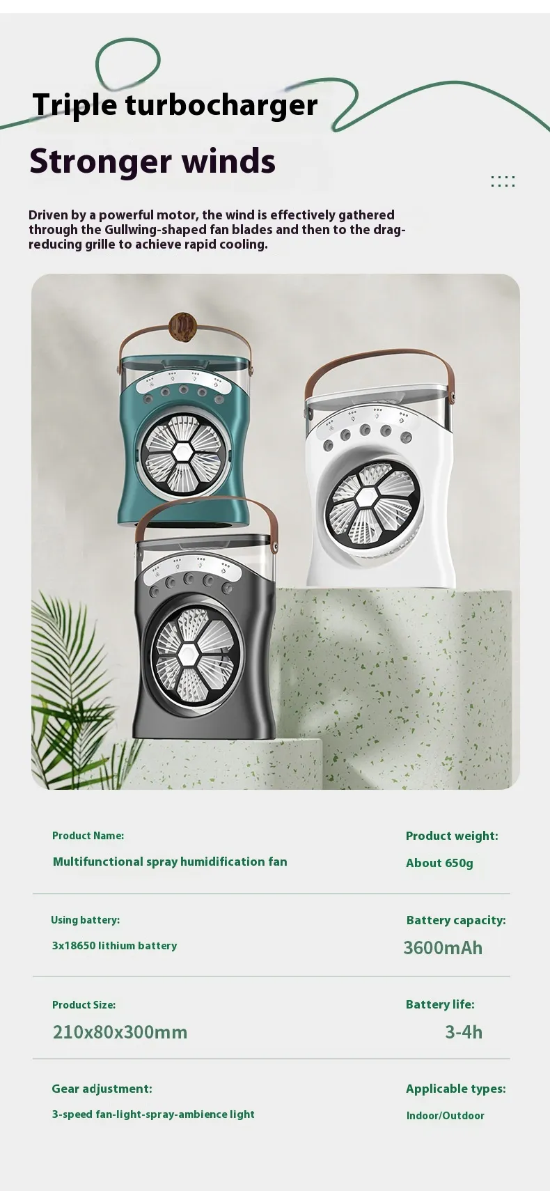 Designed for portability, the fan's compact size makes it easy to carry and store. Its lightweight construction ensures that you can take it anywhere—from your desk to your bedside table, or even outdoors during travel or camping trips.