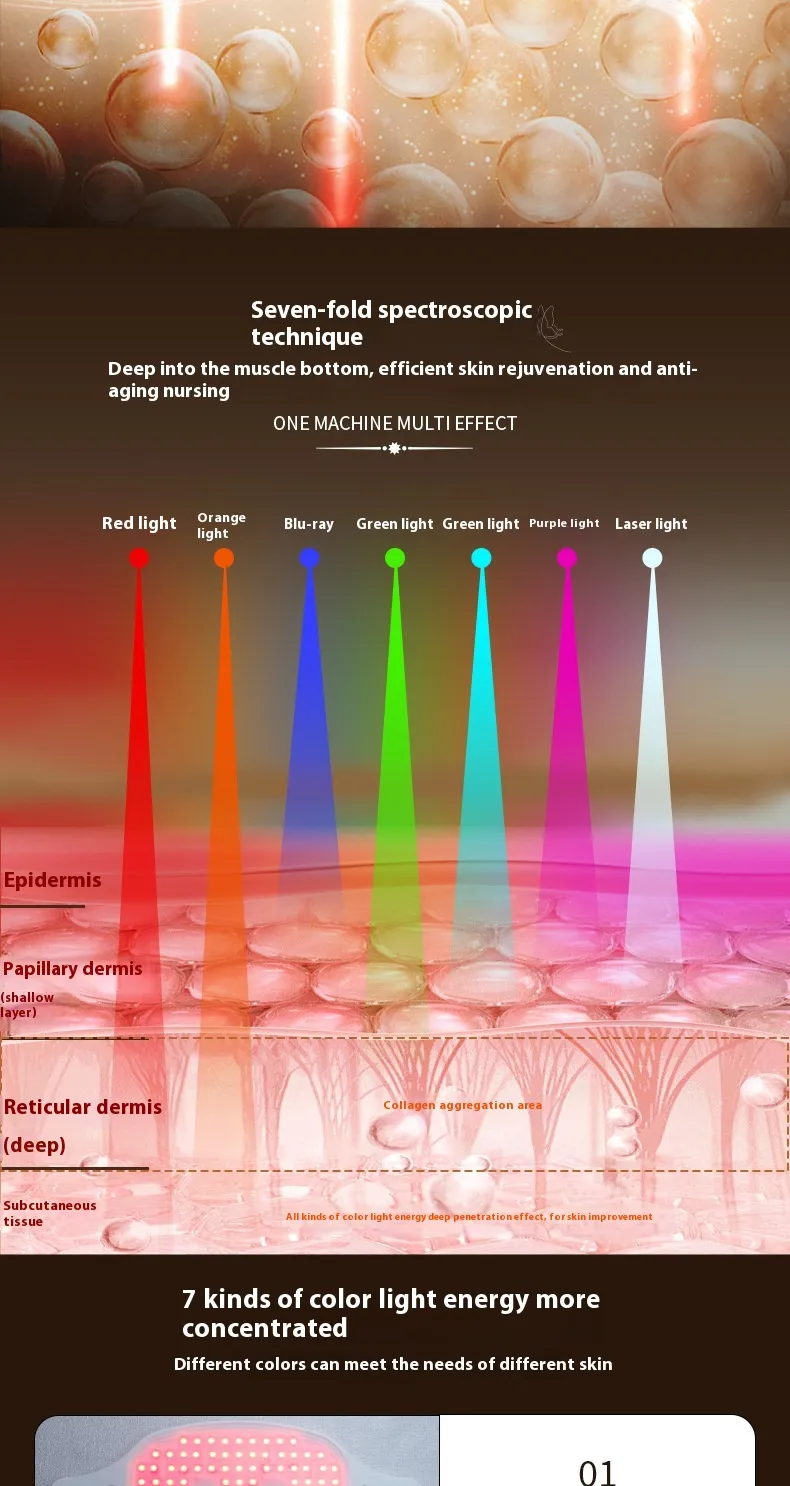 - Red Light: Stimulates collagen production for anti-aging, reducing fine lines and wrinkles.