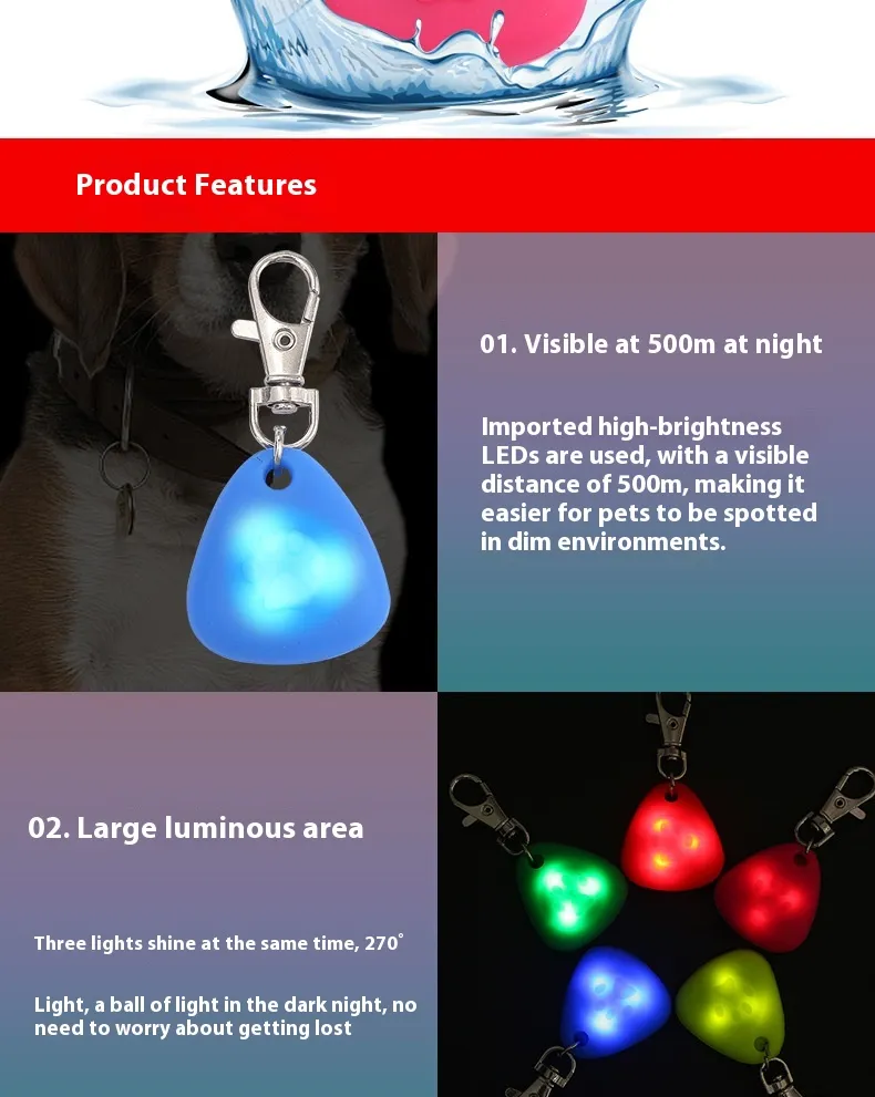 The Silicone Triangle Pendant Light-emitting Pendant Pet Supplies Ornaments is a must-have for pet owners who value both style and safety. Whether you're looking to increase your pet’s visibility at night or simply add a fun and stylish accessory to their outfit, this pendant does it all. Its LED light feature ensures your pet is visible during low-light conditions, making it perfect for evening walks, outdoor adventures, or nighttime play.