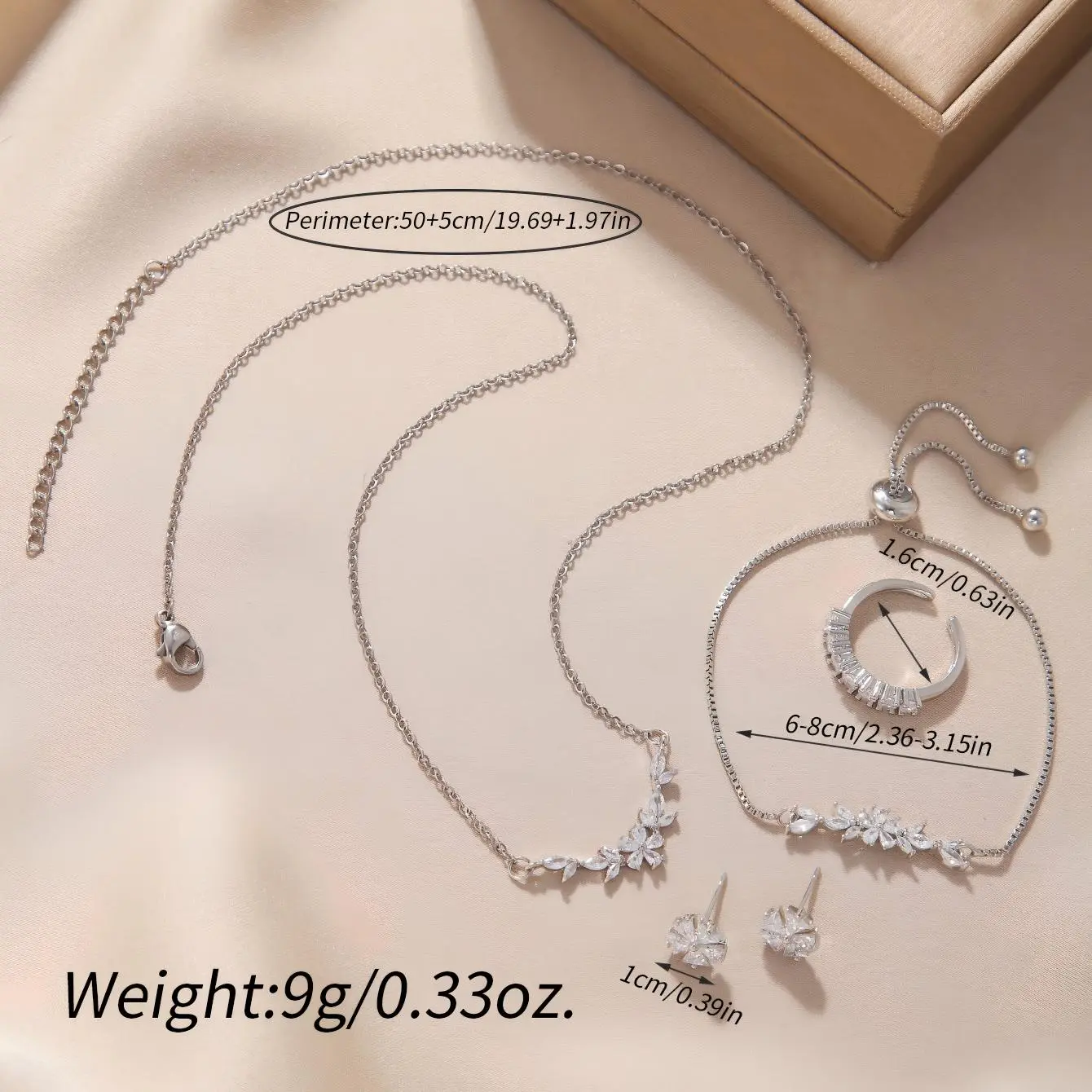 Simple Elegant Zircon Inlaid Jewelry Set Silver Flower Necklace Exquisite Earrings Bracelet Ring Suitable For Women's Daily Holiday Wear