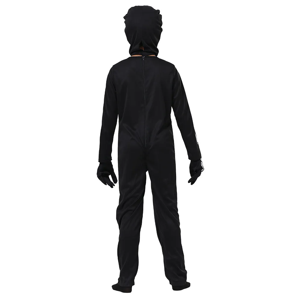 The Skeleton Costume is typically made of stretchy, comfortable fabric such as polyester or spandex, designed to fit like a second skin. These costumes feature printed or stitched bone patterns across the entire body, from the head to the feet. The bones are often depicted in white or glow‑in‑the‑dark shades to create a striking contrast against the black background of the suit.