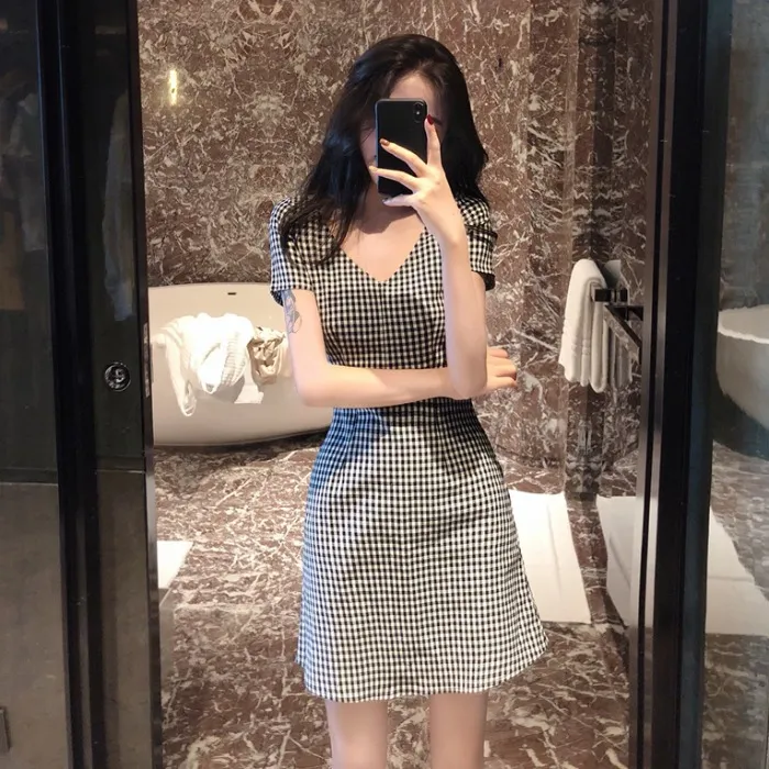 Robe femmes 2020 été nouveau mince col en v taille haute manches courtes femmes Plaid rétro tout-match doux respirant vêtements fille Chic