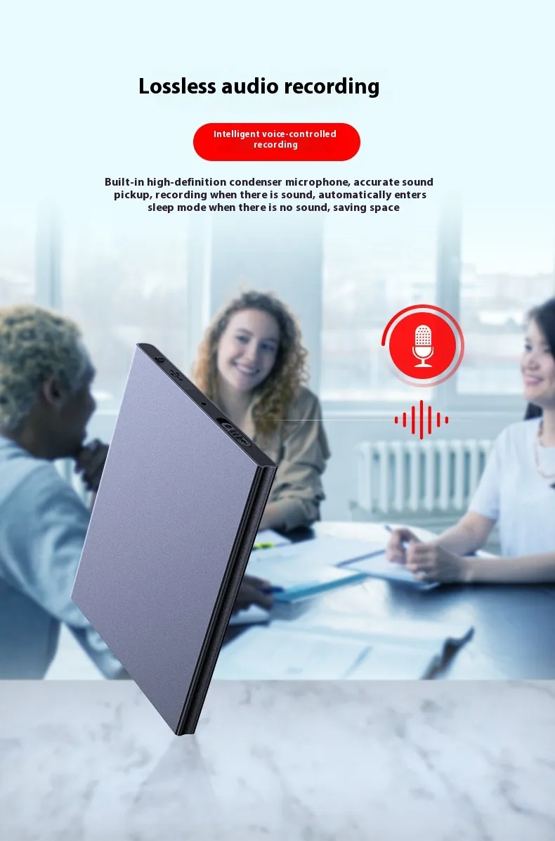 Designed for convenience, this recorder is ultra-thin, lightweight, and easy to carry. Slip it into your pocket, bag, or notebook for discreet recording anytime, anywhere.