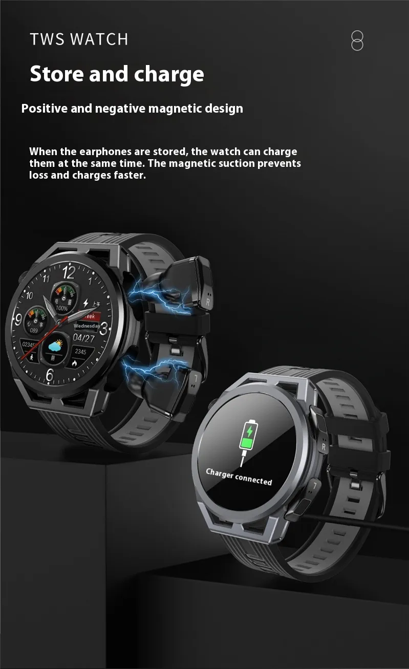 Gone are the days of juggling multiple devices. This 2-in-1 smartwatch and headset combines the best of both worlds, providing convenience and efficiency. The detachable TWS earbuds are integrated into the watch, allowing you to switch effortlessly between smartwatch and audio functionalities.