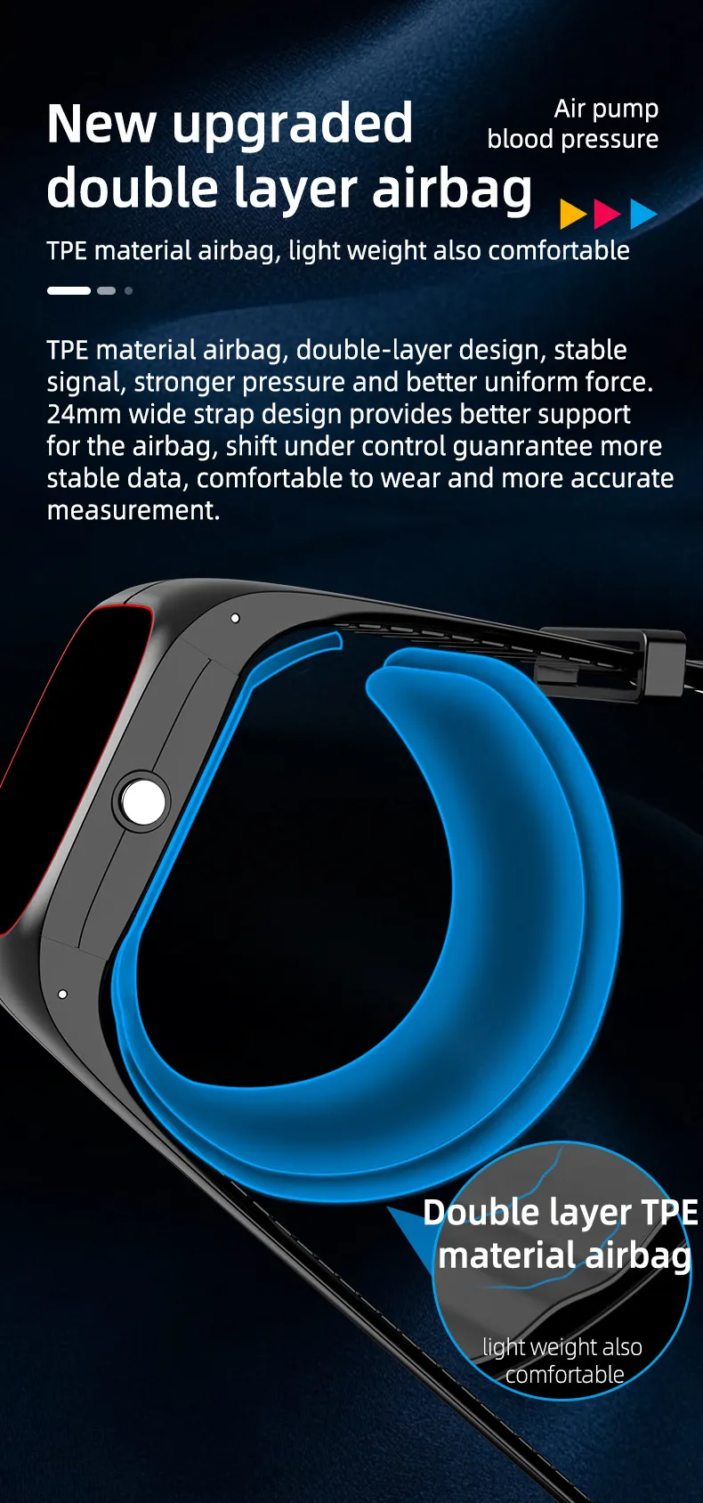 Functions: step counting, heart rate monitoring, blood pressure measurement, smart reminder, remote control selfie, sleep monitoring, blood