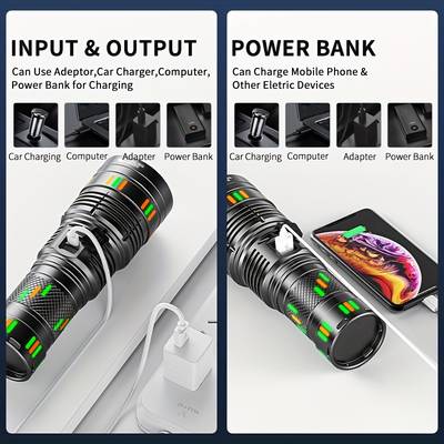 Equipped with a USB-powered rechargeable lithium battery (2800mAh), this flashlight offers long-lasting performance and convenience,