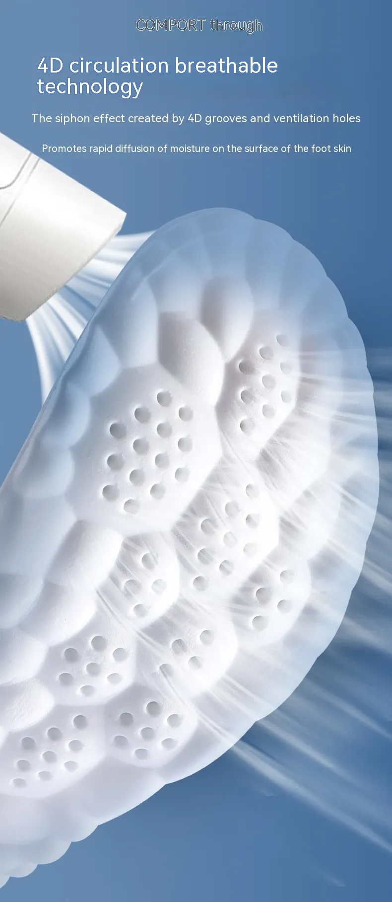 The surface of the insoles features breathable materials that help manage moisture and maintain a fresher foot environment. This can help reduce discomfort associated with prolonged wear and provide a cooler, more comfortable experience throughout the day. Because foot health and comfort are closely connected to mobility and overall wellbeing, these insoles help make everyday activities more enjoyable and less strenuous.