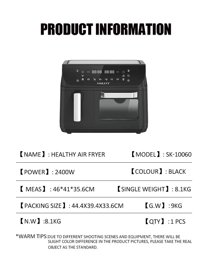 The SOKANY10060 Air Fryer is a state-of-the-art kitchen appliance designed to revolutionize your cooking experience. With its impressive 12.5L capacity, dual-pot functionality, and advanced visualization features, this air fryer offers a healthier and more efficient way to prepare your favorite meals. Whether you're cooking for a large family or entertaining guests, the SOKANY10060 ensures that every dish is cooked to perfection with minimal oil, preserving the natural flavors and nutrients of your ingredients.