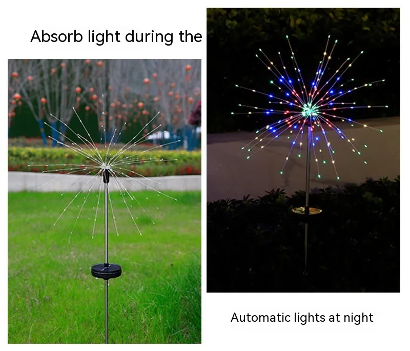 The lamp is constructed for outdoor use, with materials designed to withstand typical weather conditions. The flexible light arms allow for slight movement in the breeze, adding a dynamic visual effect that mimics real fireworks. During the day, the lamp blends naturally into garden settings, while at night it becomes a striking focal point.