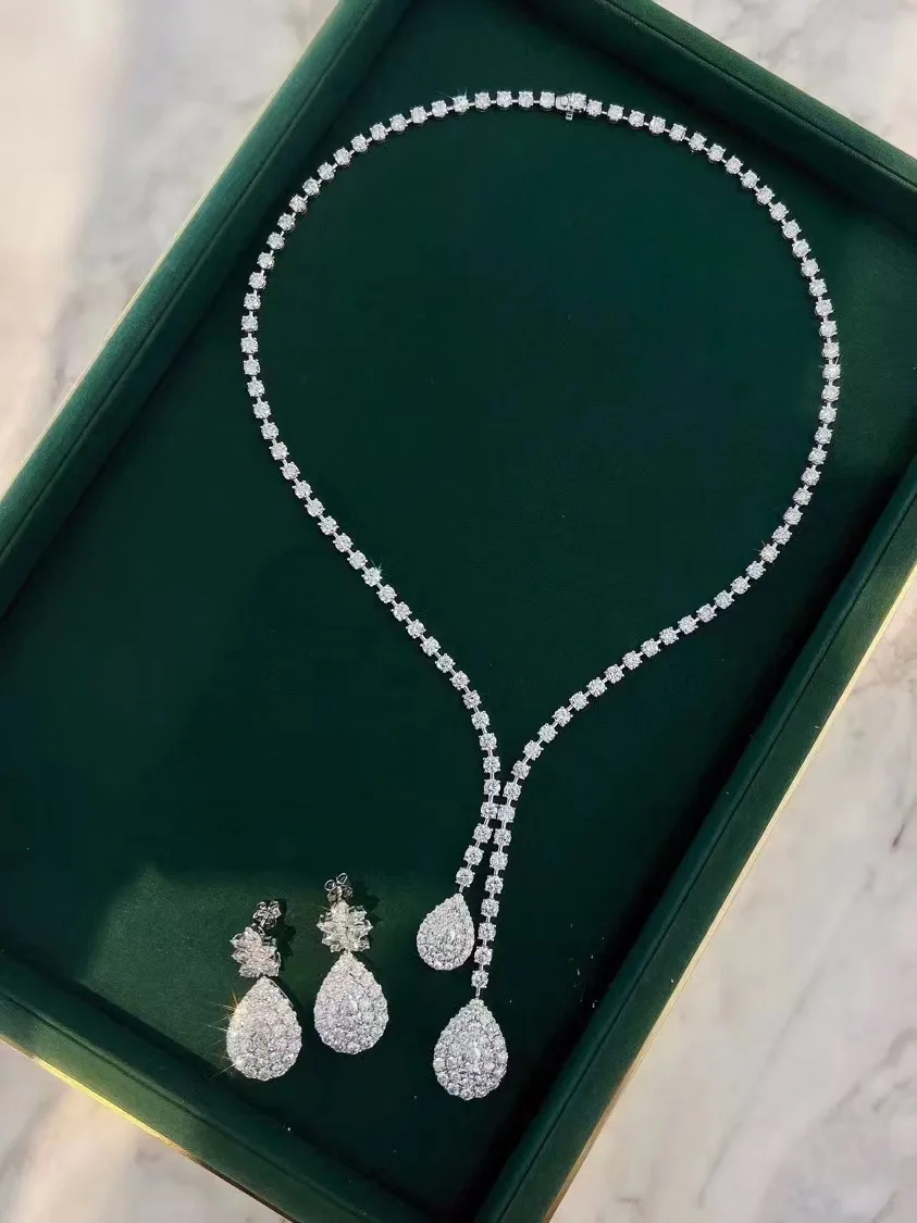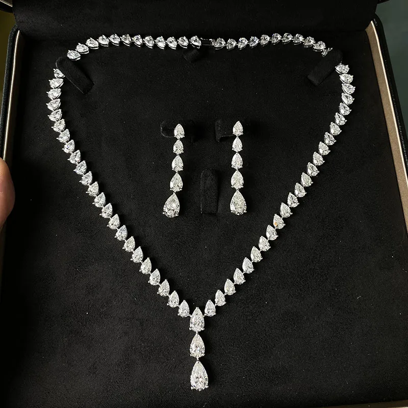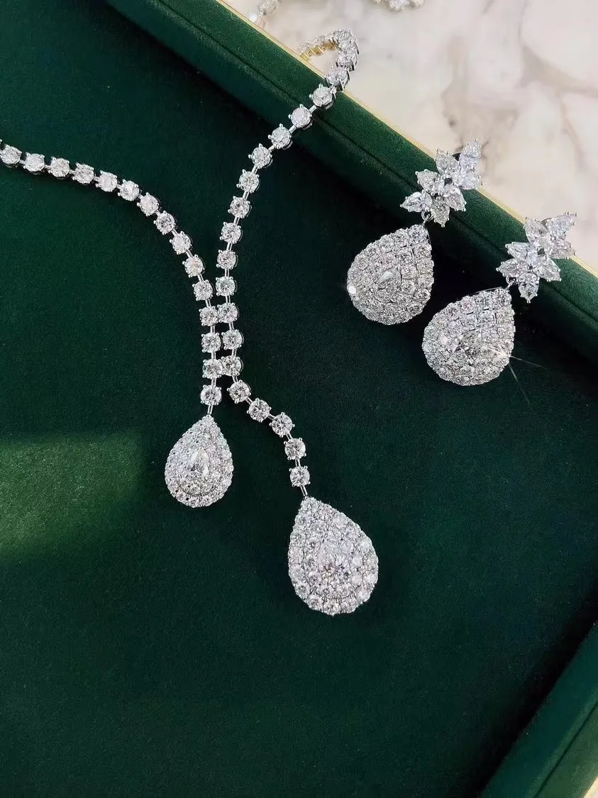 The set includes pear-cut diamond earrings, designed to complement the necklace and create a cohesive, glamorous look.