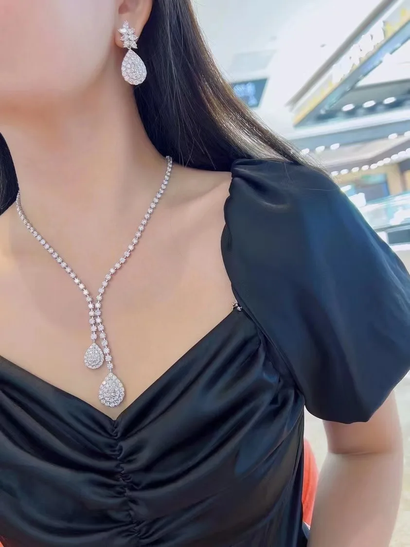 The set includes pear-cut diamond earrings, designed to complement the necklace and create a cohesive, glamorous look.