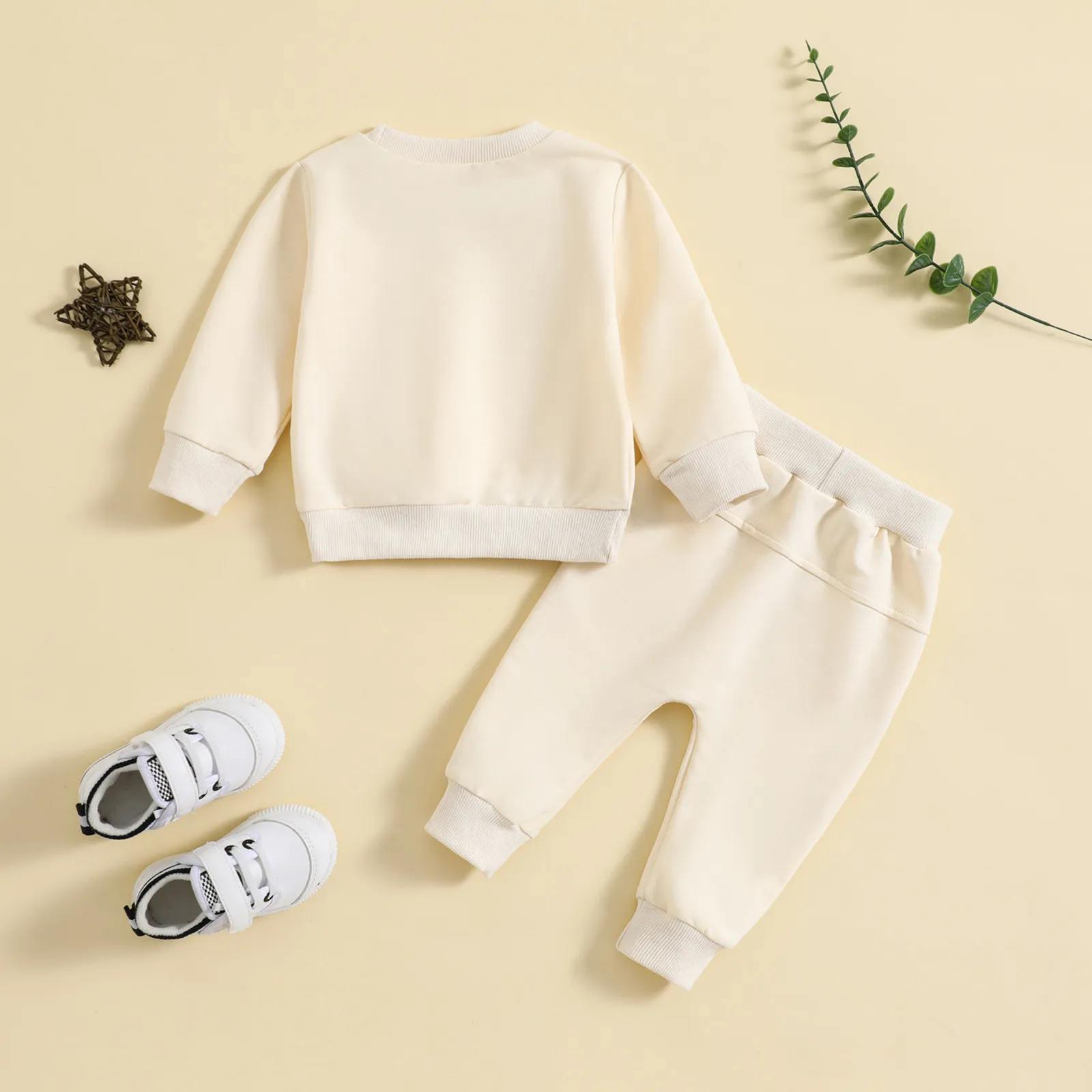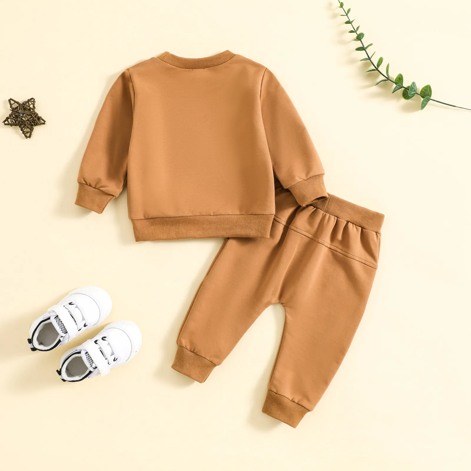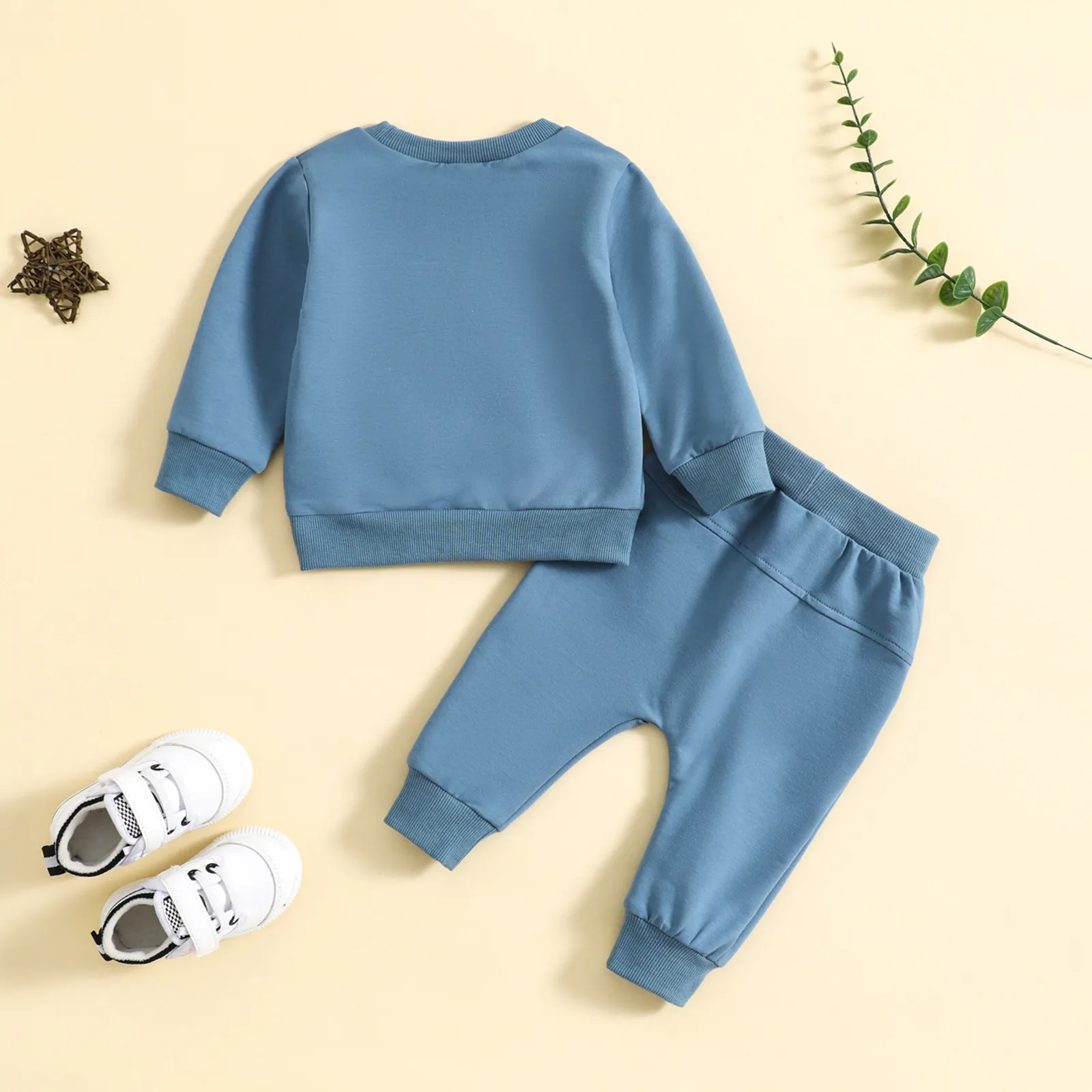 The Solid Color Alphabet Embroidery Long-sleeved Sweater and Trousers Two-piece Set is a stylish, comfortable, and versatile outfit designed for children. This set combines a soft, long-sleeved sweater with embroidered alphabet detailing and matching trousers, making it perfect for both casual outings and laid-back days at home. Crafted with care, this two-piece set provides a cozy and fashionable option for keeping your child warm and stylish throughout the seasons.