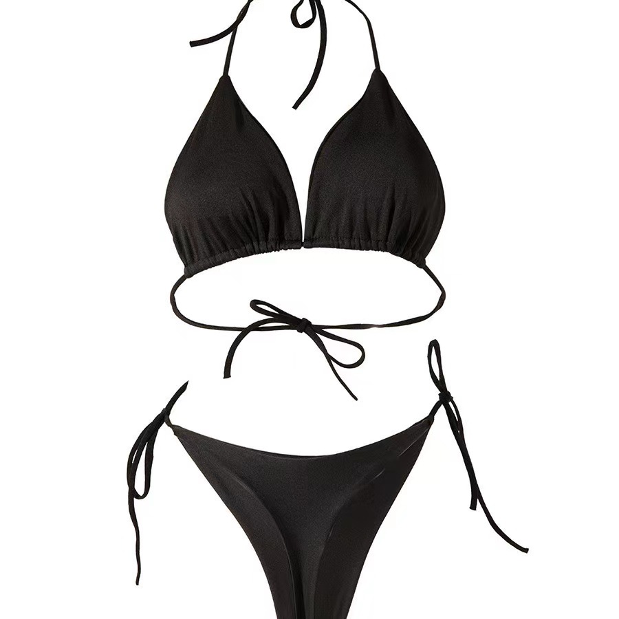 This Solid Color Lace-up Bikini features a three-point design with a flattering T-back. The bikini is crafted from high-quality polyester fiber, providing a comfortable and durable wear. The minimalist style is enhanced by the lace-up details, allowing for adjustable fit and adding a touch of sophistication to the swimsuit. Available in various solid colors, this bikini set is perfect for those who prefer a sleek and elegant beach look.