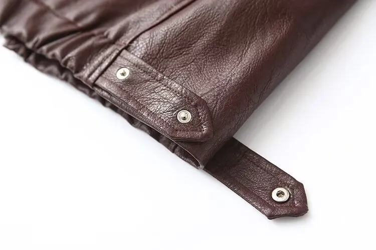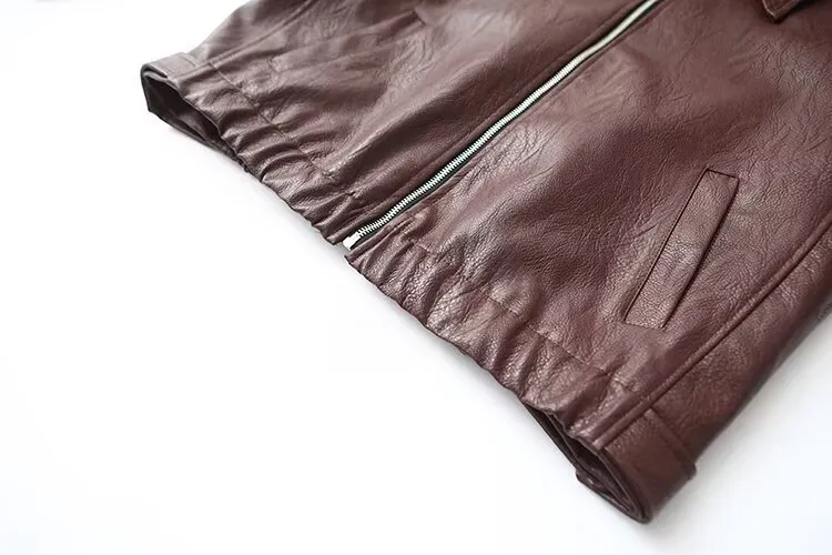 Crafted from imitation leather with a smooth polyester blend, this jacket boasts a zipper closure for easy wear and a sleek, modern look. The lapel collar adds a hint of sophistication, while the long sleeves keep you warm. Available in versatile colors like burgundy and black, this jacket complements a variety of outfits and occasions.