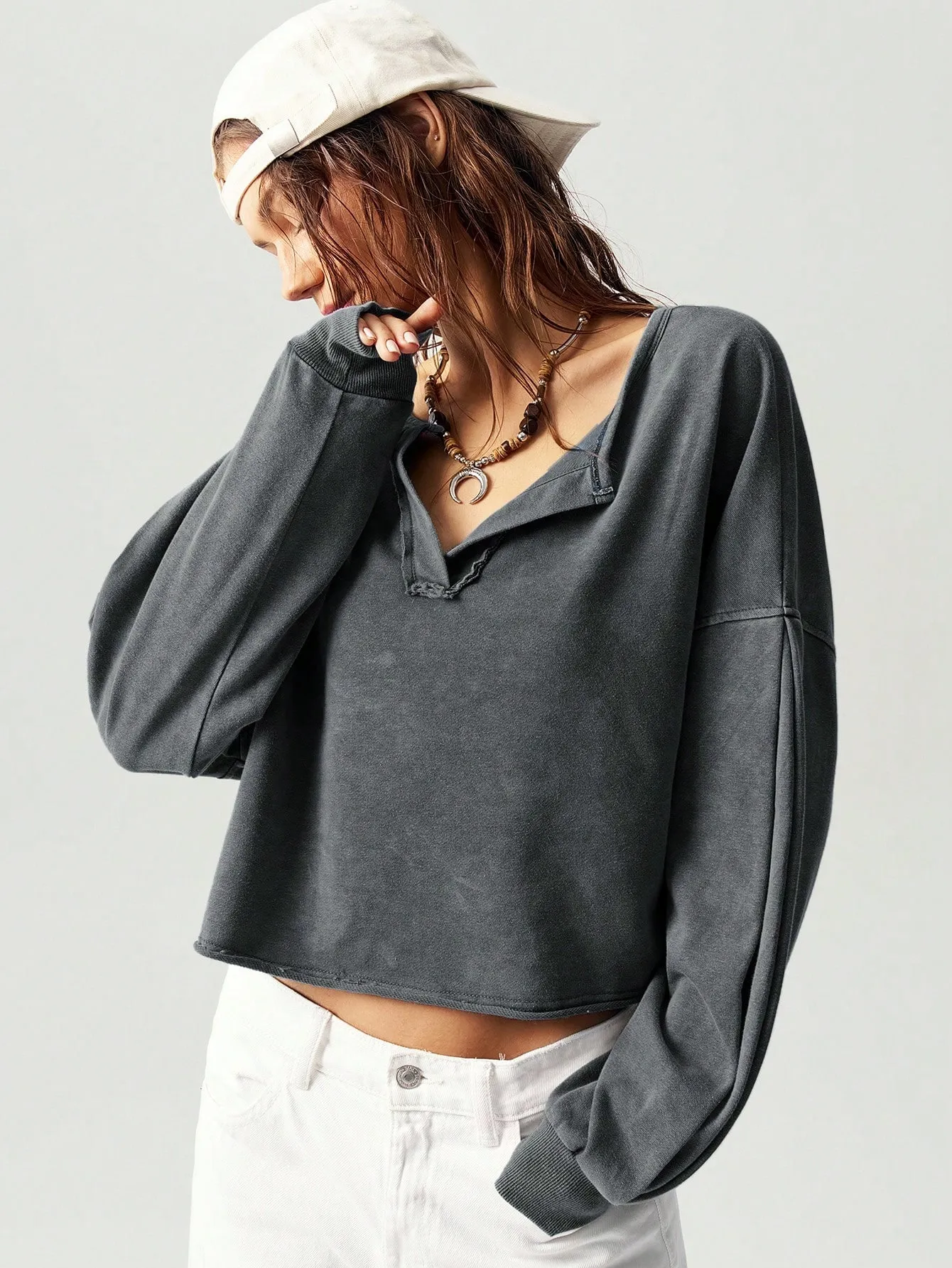Solid Color V-neck Long Sleeved Loose Fitting Pullover