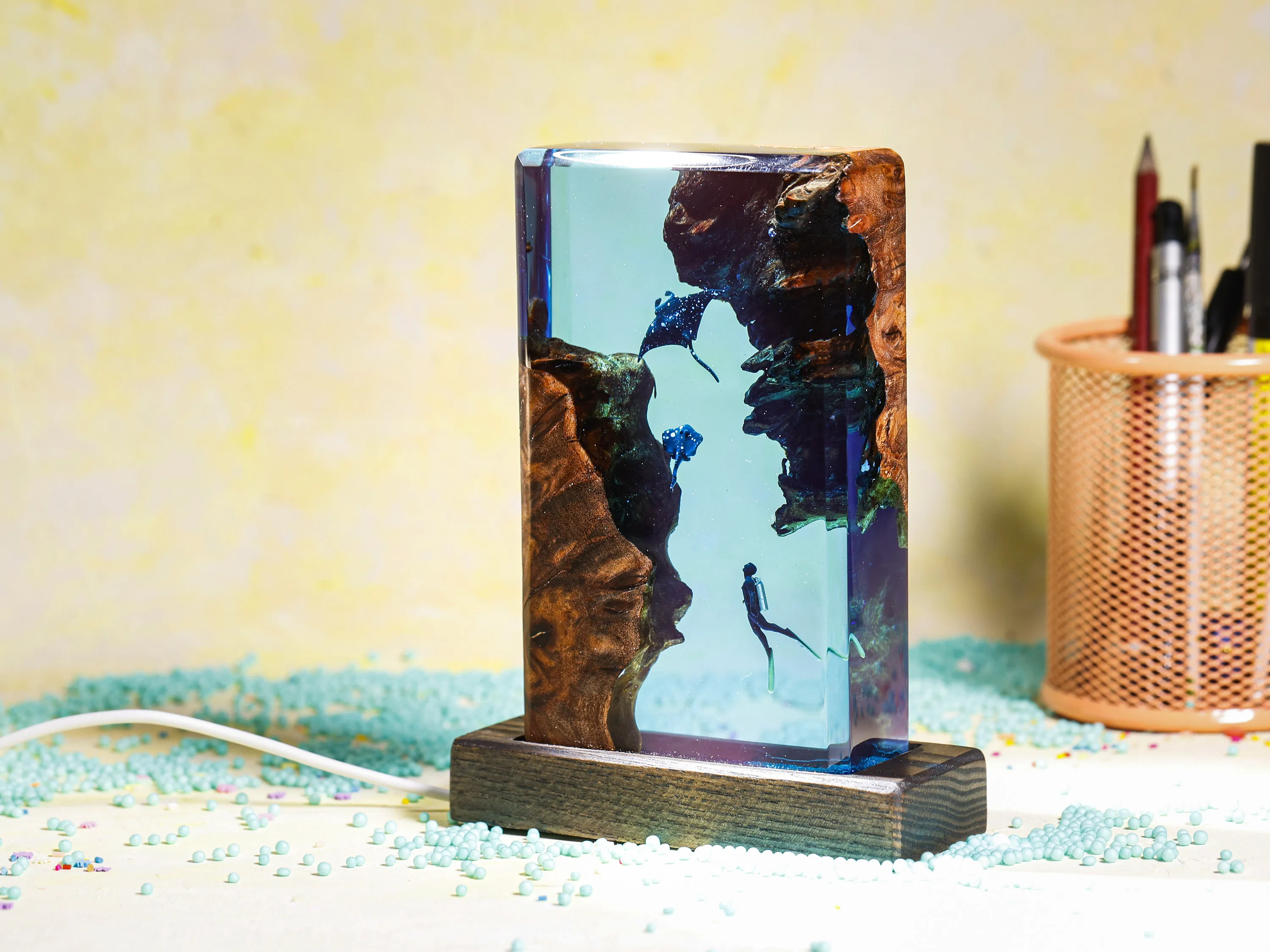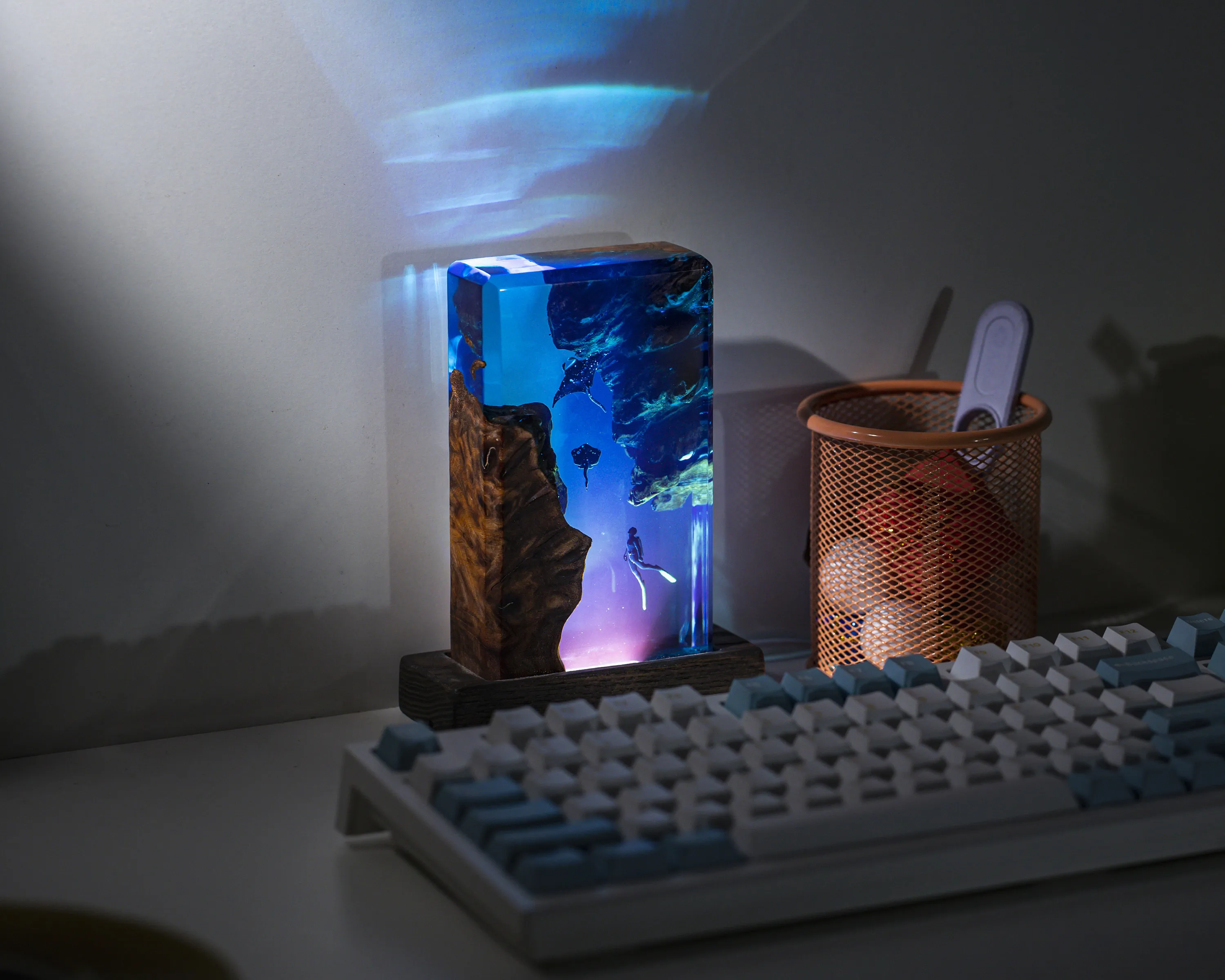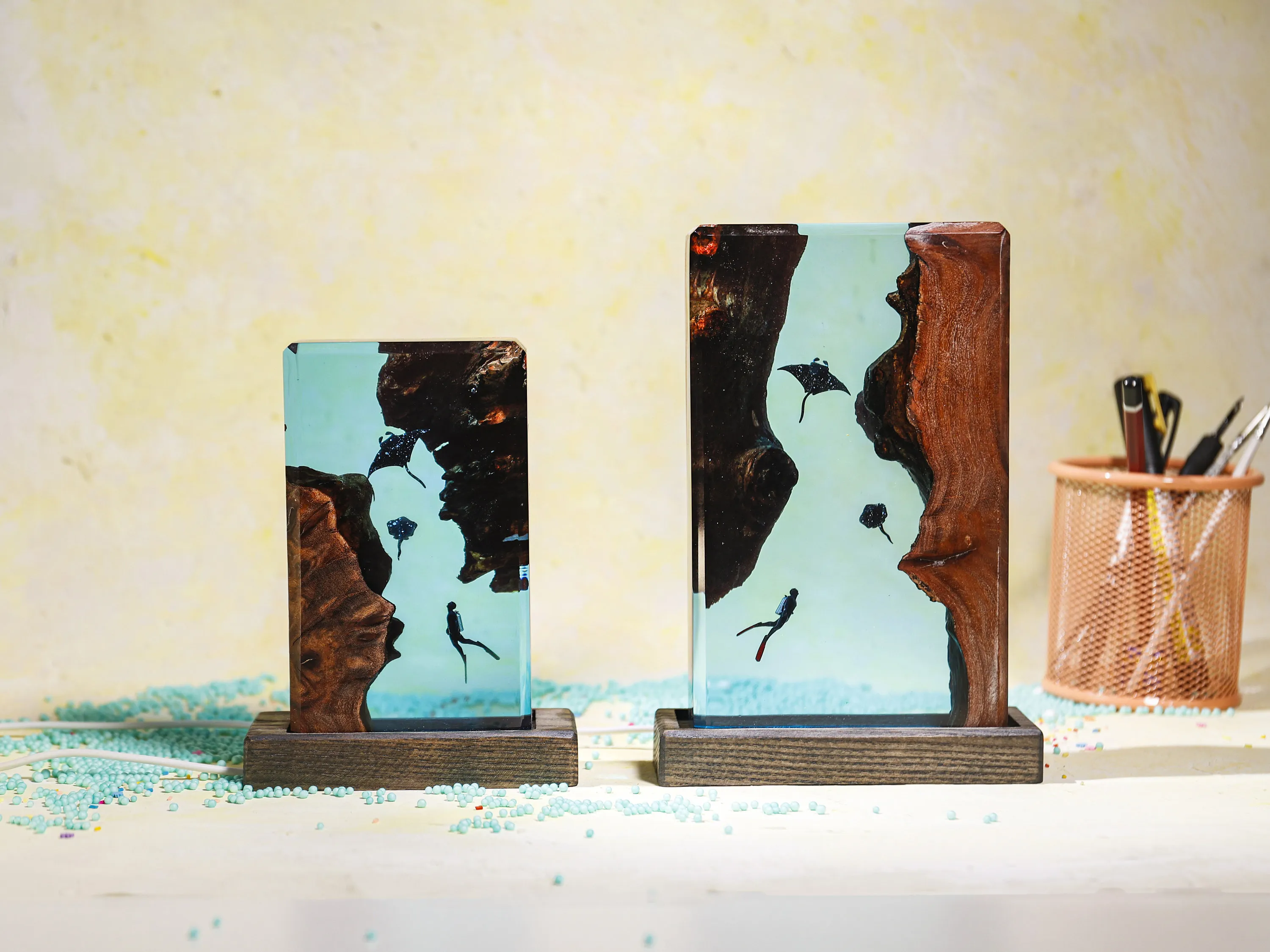 The Square Wood Resin Ocean Small Night Lamp is a stunning combination of natural wood and resin, designed to bring a calming oceanic vibe to your space. Perfect for coastal-themed décor, this small night lamp features a mesmerizing design that captures the beauty of the ocean with its vibrant blue resin encased in solid wood. The soft, ambient LED light glows through the translucent resin, creating a peaceful and soothing atmosphere, making it perfect for bedrooms, living rooms, or any space where you want to add a touch of natural elegance.