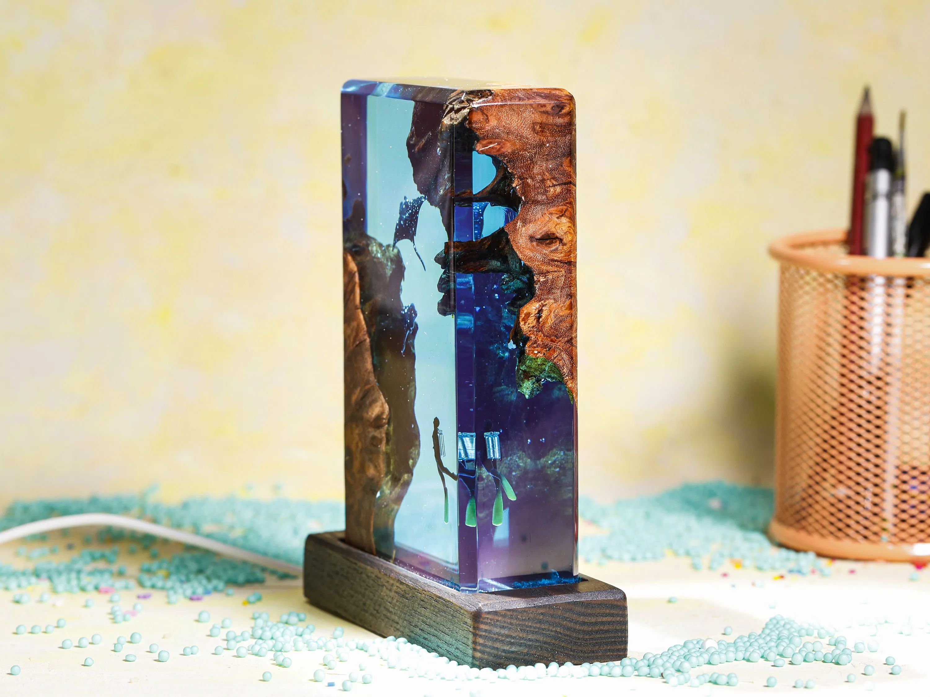 Crafted with attention to detail, this night lamp offers both aesthetic appeal and functionality. The compact and square shape makes it easy to place on bedside tables, desks, or shelves, adding a unique decorative touch to any room. The warm LED light is energy-efficient and long-lasting, providing a gentle glow that’s ideal for creating a cozy, relaxing environment without being too bright. The combination of natural wood and ocean-like resin adds a modern yet rustic feel to the lamp, making it a versatile addition to any home décor style.