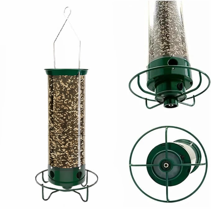 The tube bird feeder holds 3.5pounds of bird food and has four feeding openings and a circular perch, allowing multiple birds to feed simultaneously with a better view.