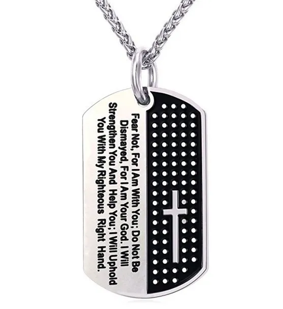 The Stainless Steel Chain Black Bible Christian Jewelry features a powerful biblical quote, offering inspiration and strength to its wearer. Engraved with the words, "Fear Not; For I Am With You: Do Not Be Dismayed; For I Am Your God. I Will Strengthen You and Help You; I Will Uphold You With My Righteous Right Hand," this necklace serves as both a beautiful accessory and a reminder of divine protection and strength. Paired with a stylish stainless steel chain and a sleek black dog tag pendant, this piece is perfect for anyone looking to wear their faith proudly.