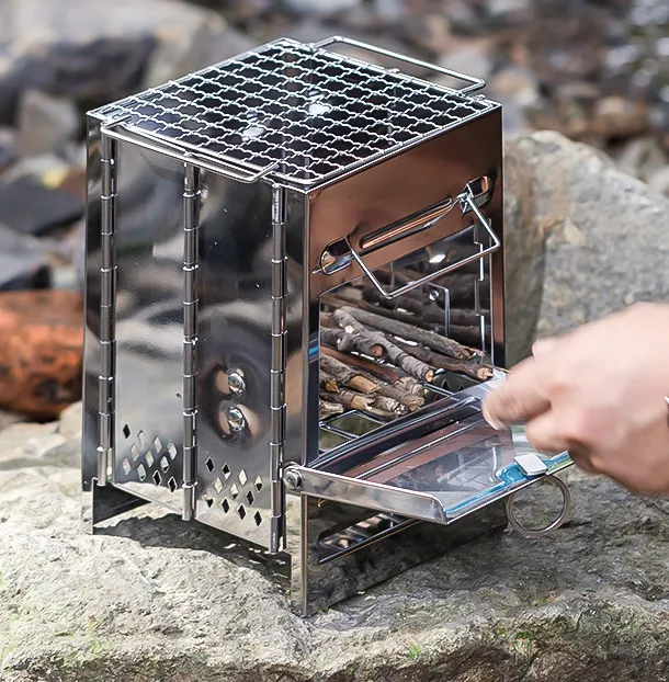 A stainless steel firewood stove is a compact, portable stove designed for outdoor camping and hiking that uses firewood as fuel. Its folding design makes it easy to carry, store, and set up, offering a reliable heat source and cooking platform in the wilderness.