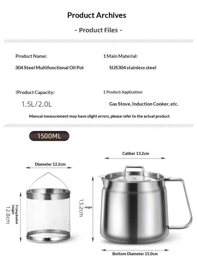 Capacity: [With filter] 304 stainless steel oil filter—1.5 liters; [With filter and fry basket] 304 stainless steel oil filter—1.5 liters;