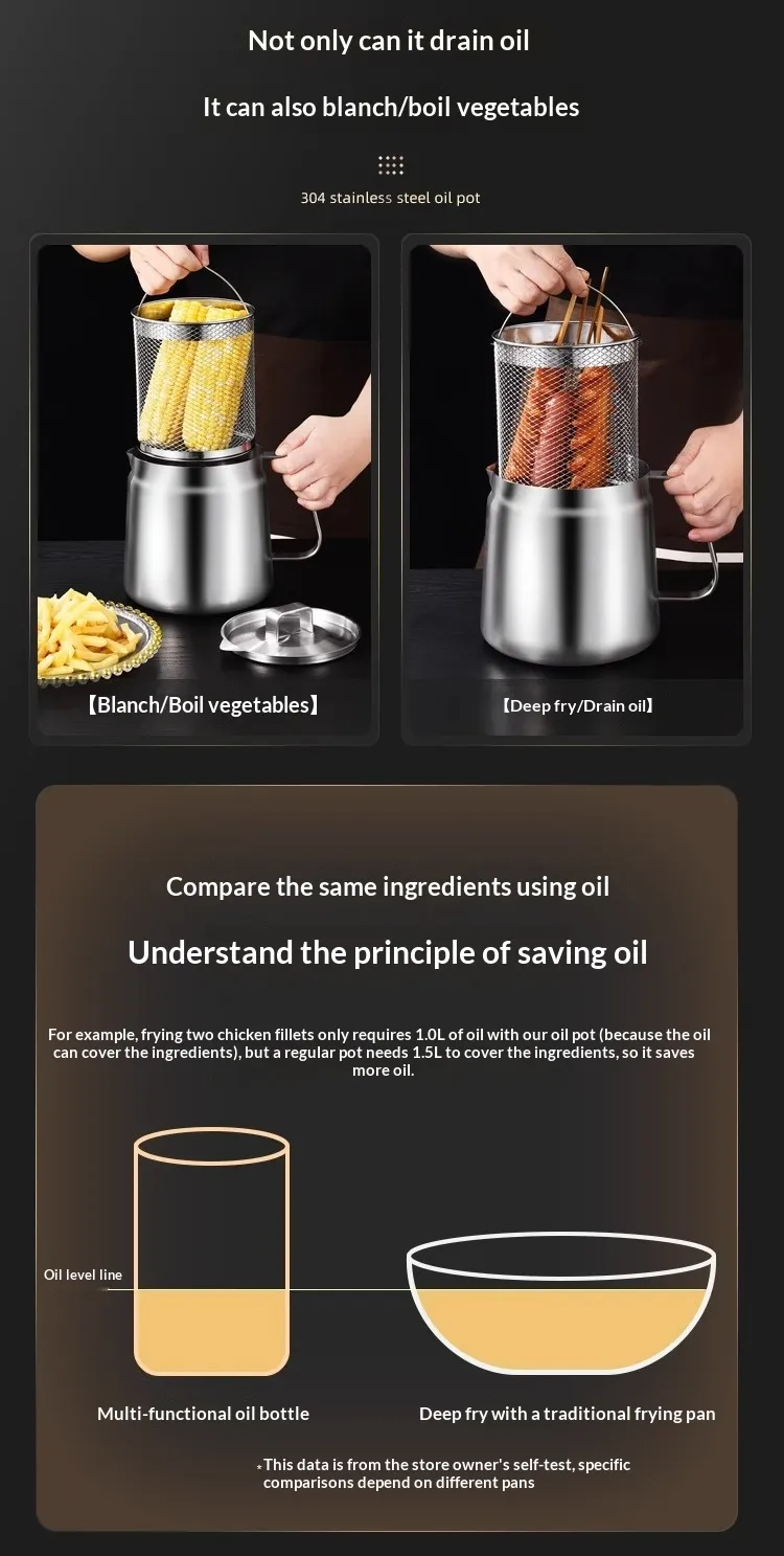 In conclusion, the Stainless Steel Oil Strainer Pot is a must-have kitchen accessory for anyone who values clean, healthy cooking. Its high-quality construction, fine mesh strainer, and ergonomic design make it the perfect tool for straining oils, broths, and sauces, ensuring a cleaner and more efficient cooking experience. Whether you're saving oil for reuse or preparing a smooth stock, this oil strainer pot is the reliable tool you need for a perfect kitchen. Upgrade your cooking routine with the Stainless Steel Oil Strainer Pot today!