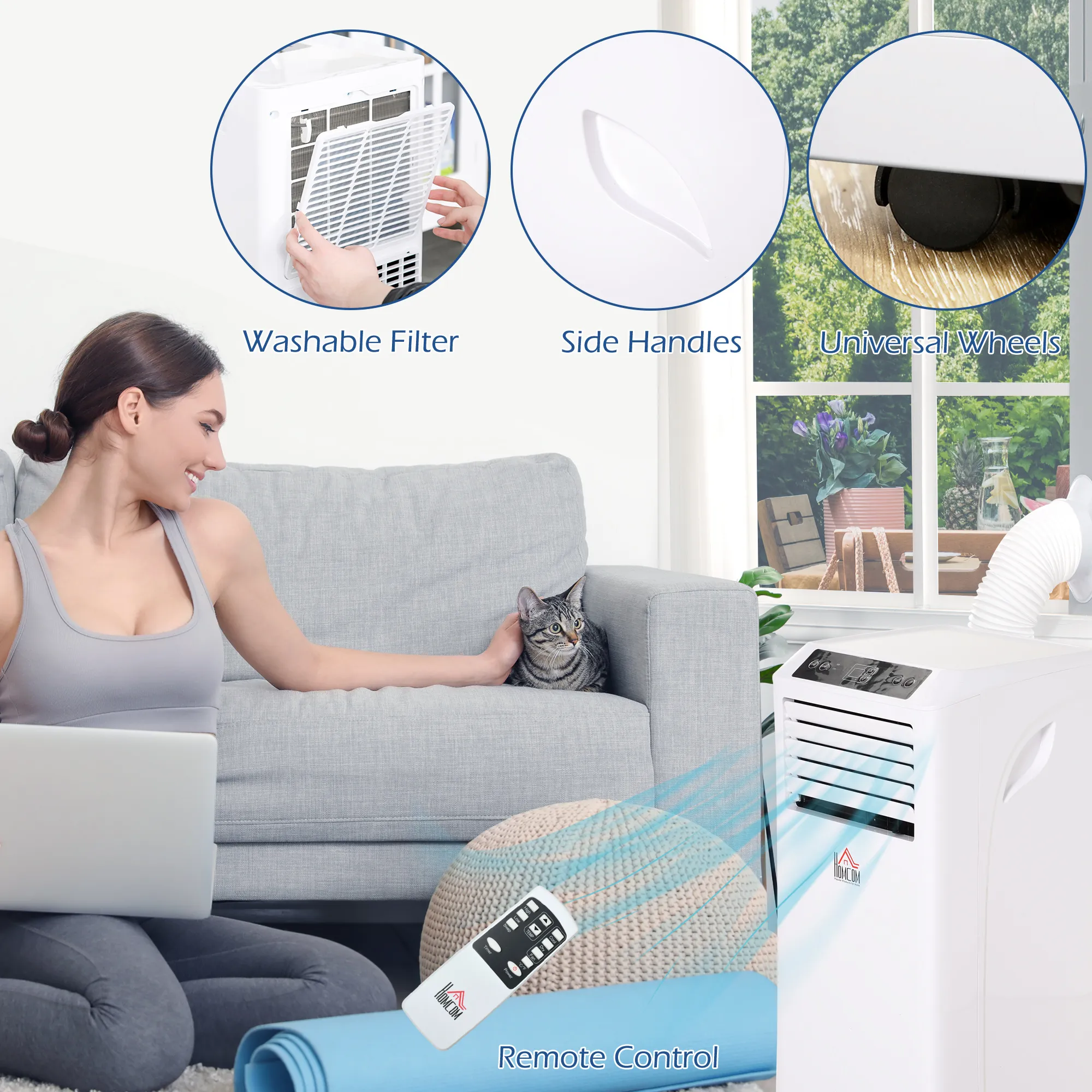 Product Name:HOMCOM 8000 BTU Mobile Portable Air Conditioner with Cooling, Dehumidifier, Ventilating, Remote Control, 24-Hour Timer, Portable AC Unit for Bedroom, Living Room, Home Office, White