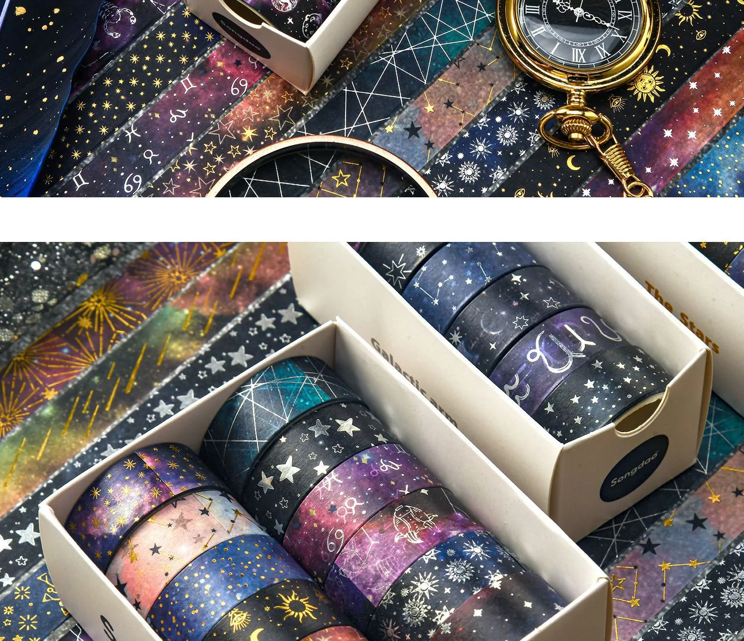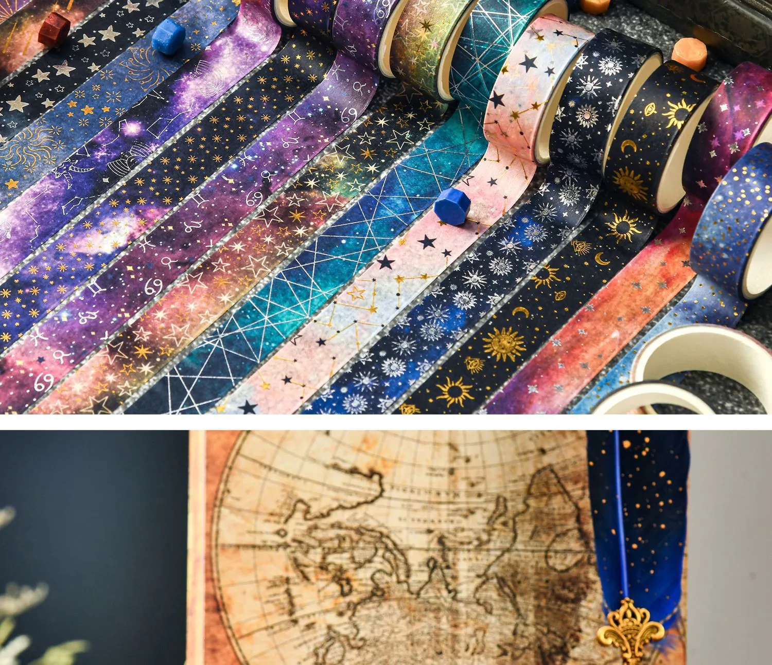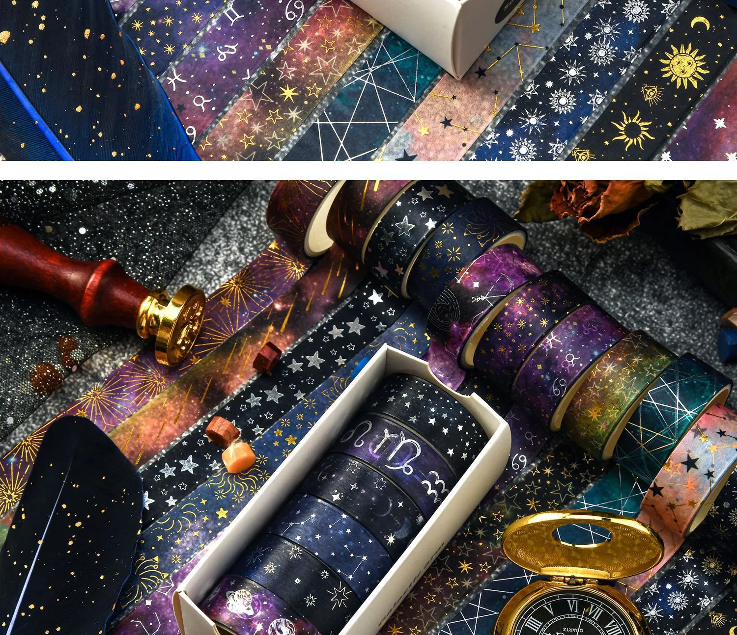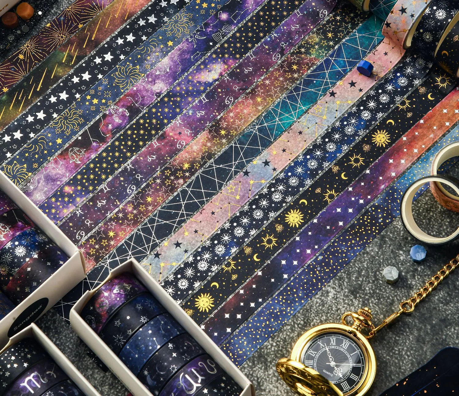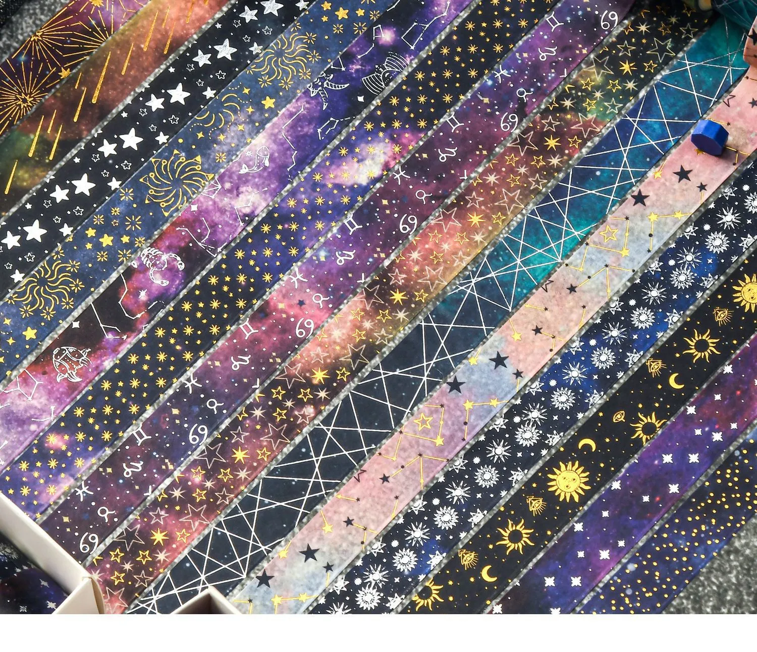 Featuring stars, moons, sunflowers, and fireworks-inspired patterns, this tape brings creativity and charm to your projects. Ideal for adding a mystical, dreamy touch to journals, planners, scrapbooks, and handmade cards.