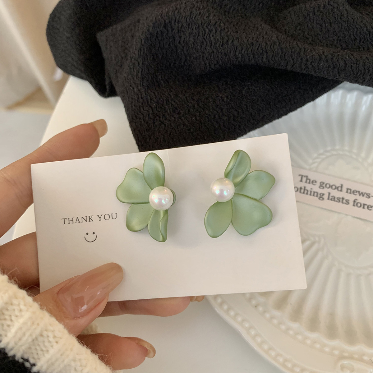 Color: two leaves White sterling silver stud earrings, two leaves beige sterling silver stud earrings, four leaves green sterling silver