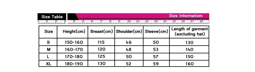 Size: S size recommended height 145-158cm, M size recommended height 159-168cm, L size recommended height 168-178cm, XL size recommended