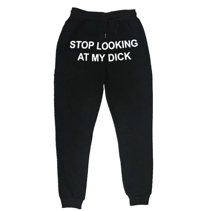 stop looking at my dick pants are a versatile and comfortable wardrobe staple that combines the relaxed fit of sweatpants with the stylish design of athletic wear. Perfect for lounging, workouts, or casual outings, jogger pants provide the ideal blend of functionality and fashion. Whether you're heading to the gym, running errands, or enjoying a laid-back weekend, jogger pants offer both comfort and a sporty look that can be dressed up or down.