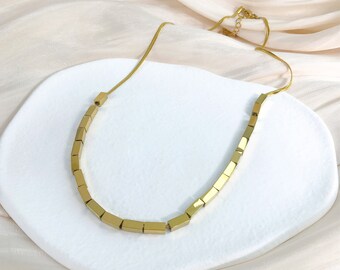 The String Square Beaded Necklace stands out with its geometric flair, where each square bead adds a modern twist to the classic beaded necklace design. The precise angles and clean lines of the square beads offer a refreshing departure from the usual round beads, making this necklace a statement piece that is both bold and sophisticated.
