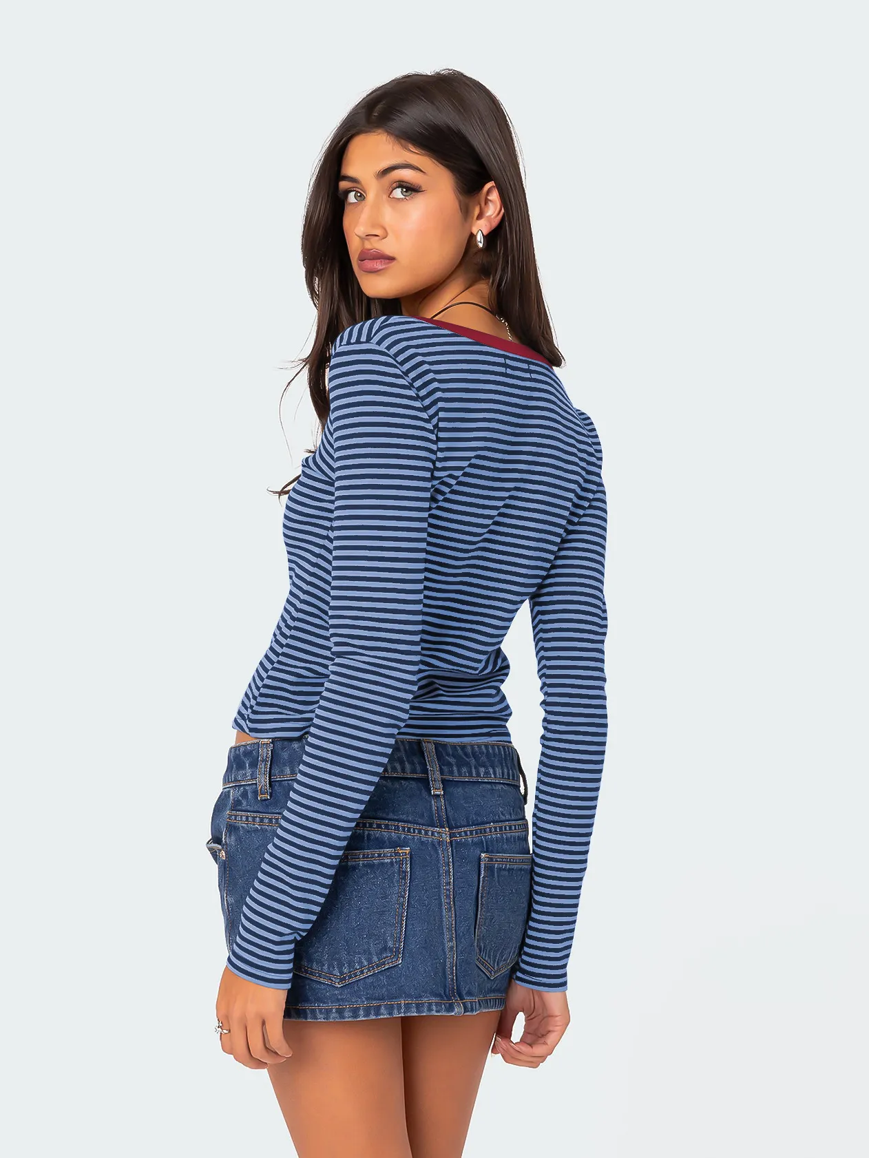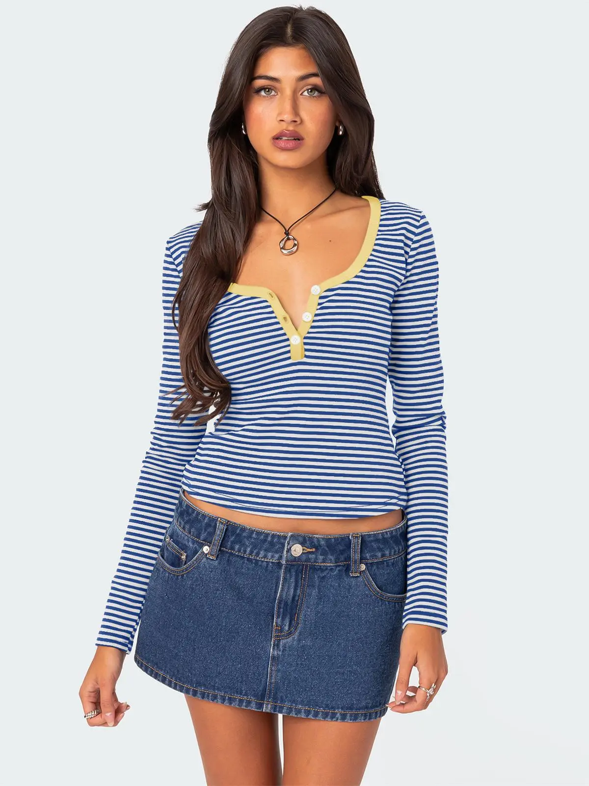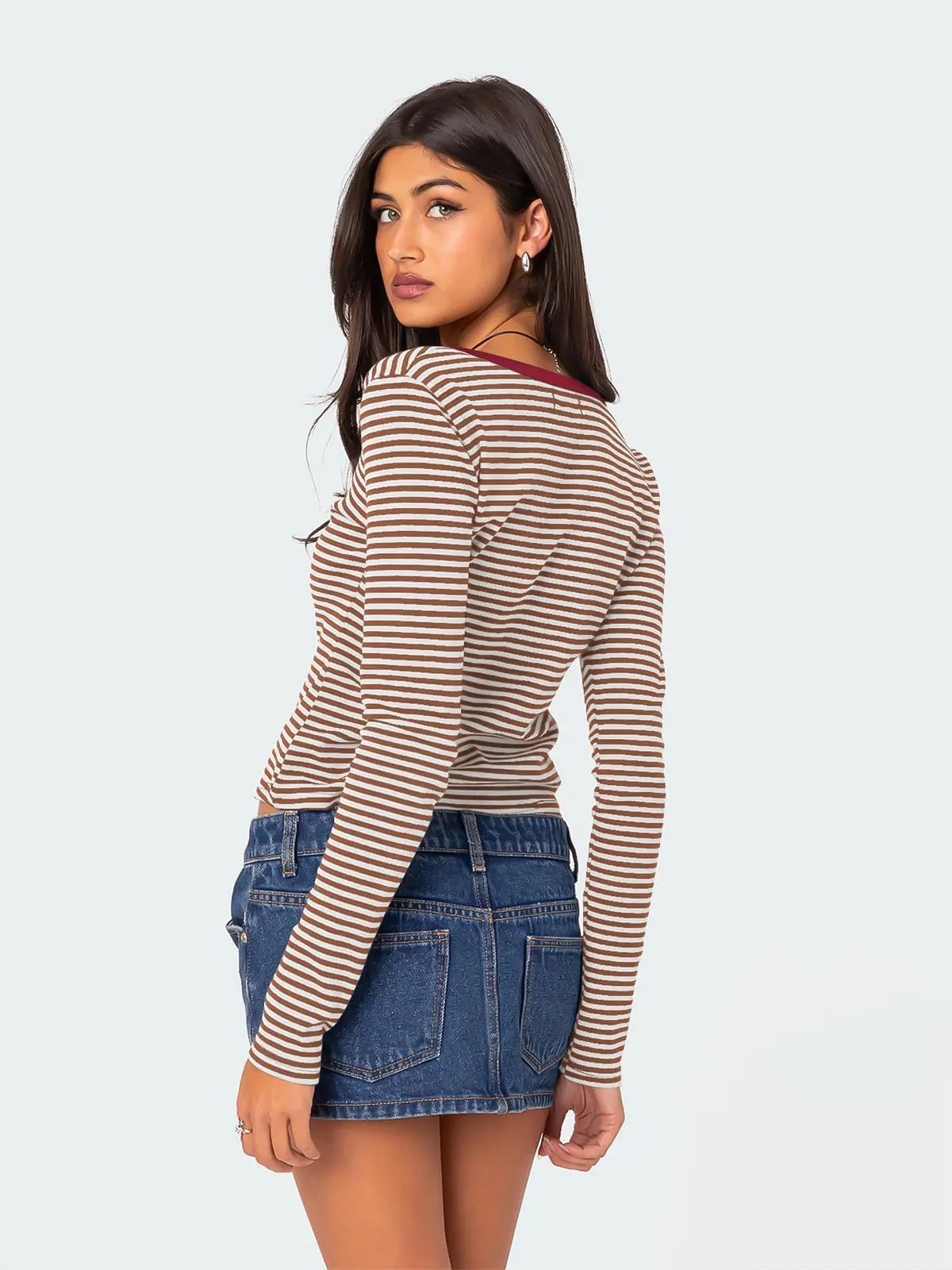 Contrast Color Striped Sweater Women’s Button Slim T-shirt