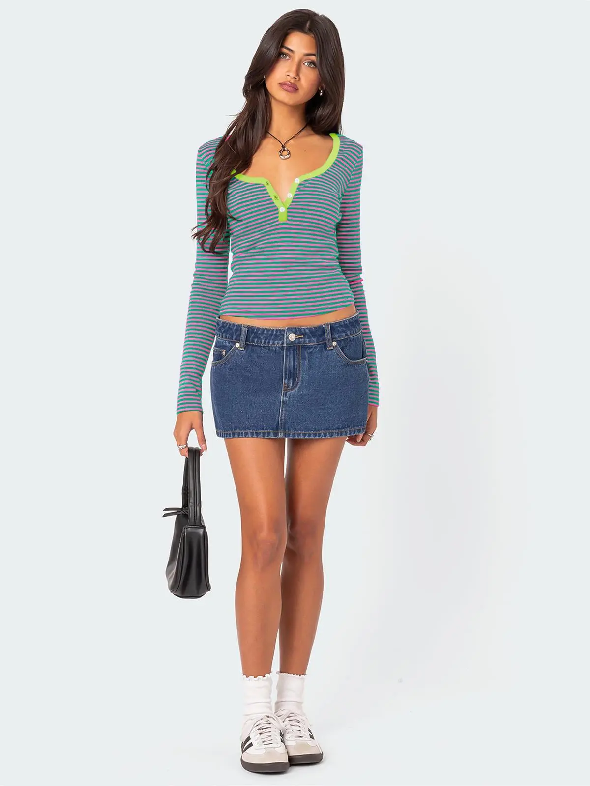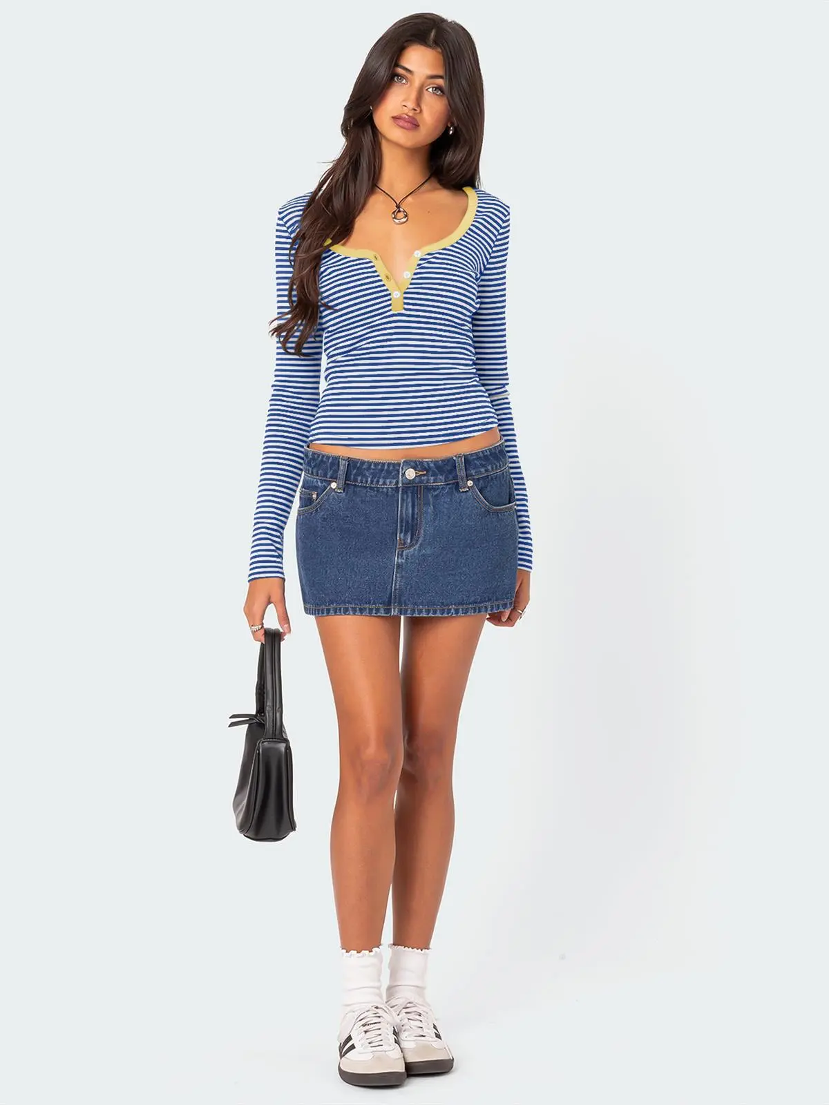 Pair this top with high-waisted jeans or skirts for a casual daytime look. Add a blazer or cardigan for a more polished appearance suitable for work or evening outings.