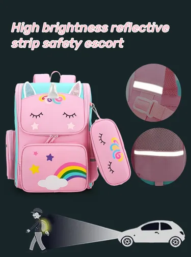 - Lovely Looking :Rainbow pattern ,pink and light green contrast color, The pockets on both sides are designed differently. A side with zipper can hold a pencil case, and the other side can hold a water bottle