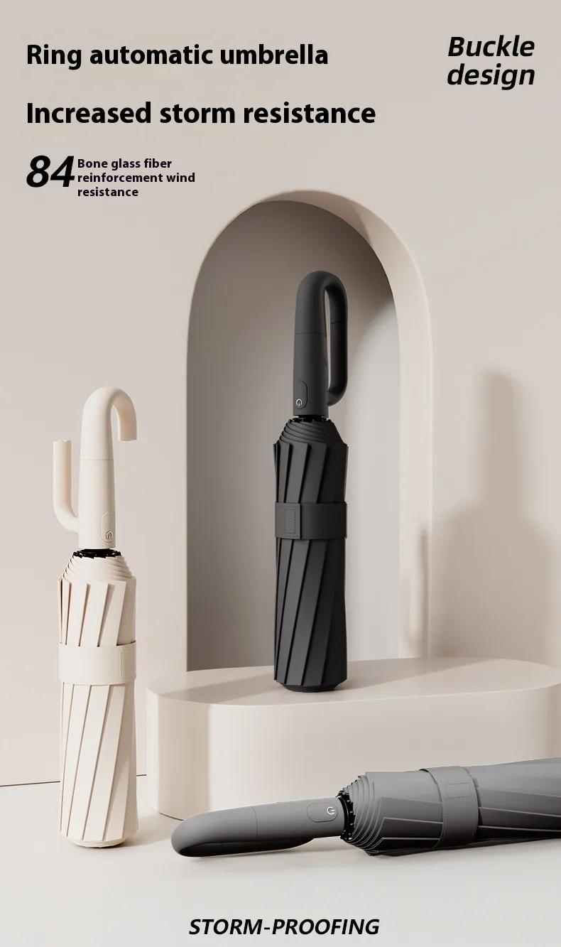 The integrated ring buckle handle enhances grip, portability, and storage convenience, making the umbrella easy to carry, hang, or secure when not in use.