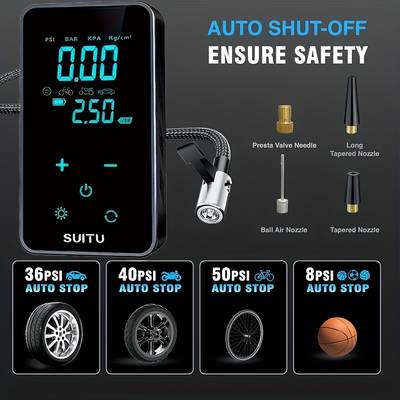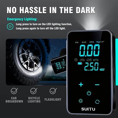 With the Suitu Portable Cordless Tire Inflator, you can inflate your tires quickly and efficiently. The digital pressure