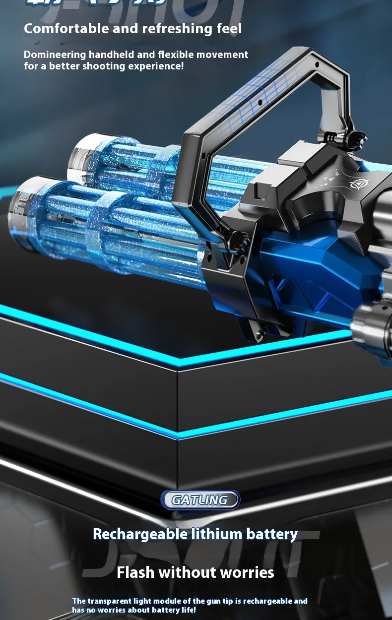 This electric Gatling water gun is designed to deliver powerful, continuous blasts of water, giving players an advantage in any water fight. Unlike traditional water guns that require manual pumping, this electric model offers effortless play, letting users focus on their aim and strategy. The steady water stream and long-range capabilities make it easy to soak opponents, adding excitement to every spray.