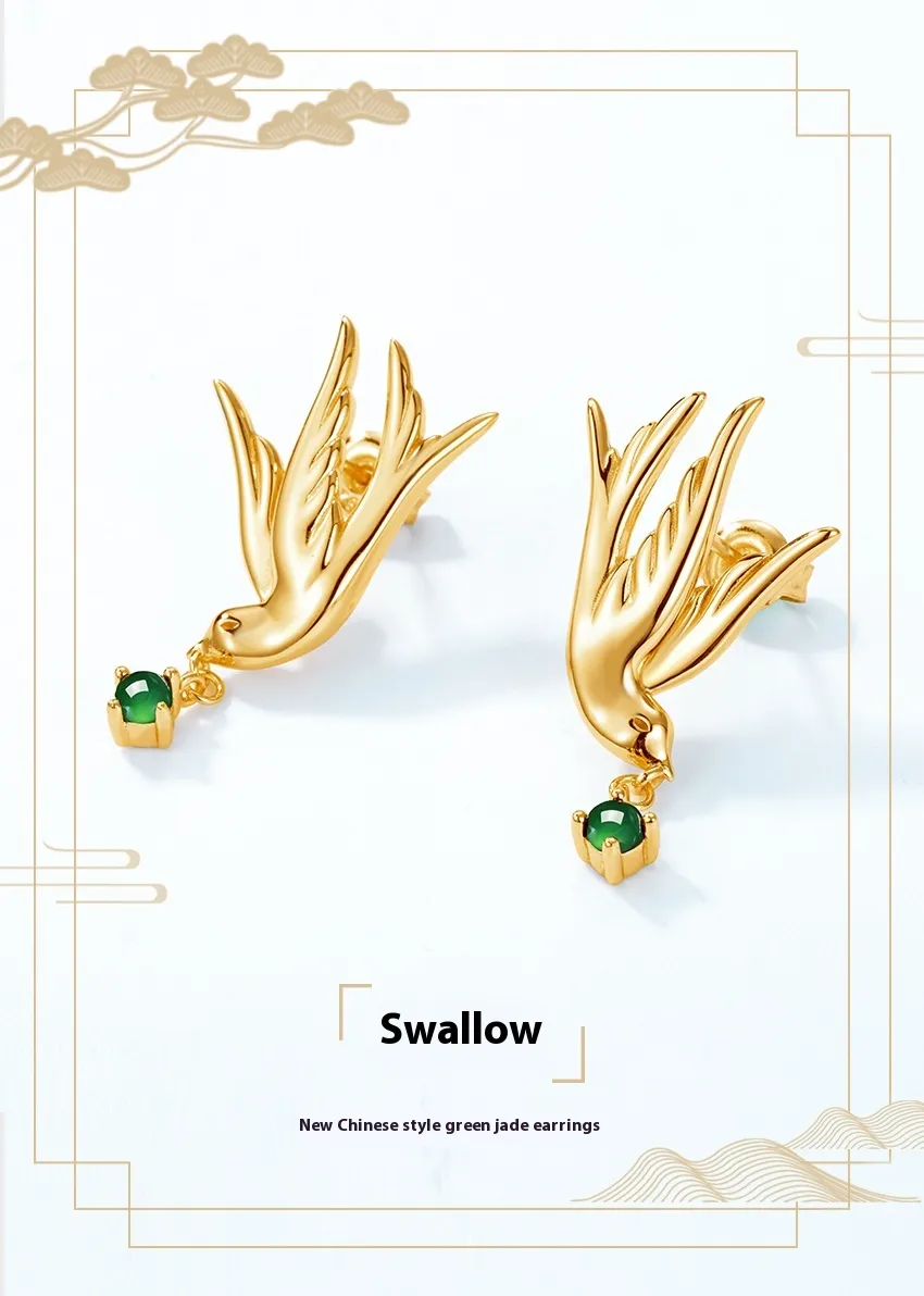 Swallow Earrings S925 Silver Plated Inlaid Green Jade Earrings
