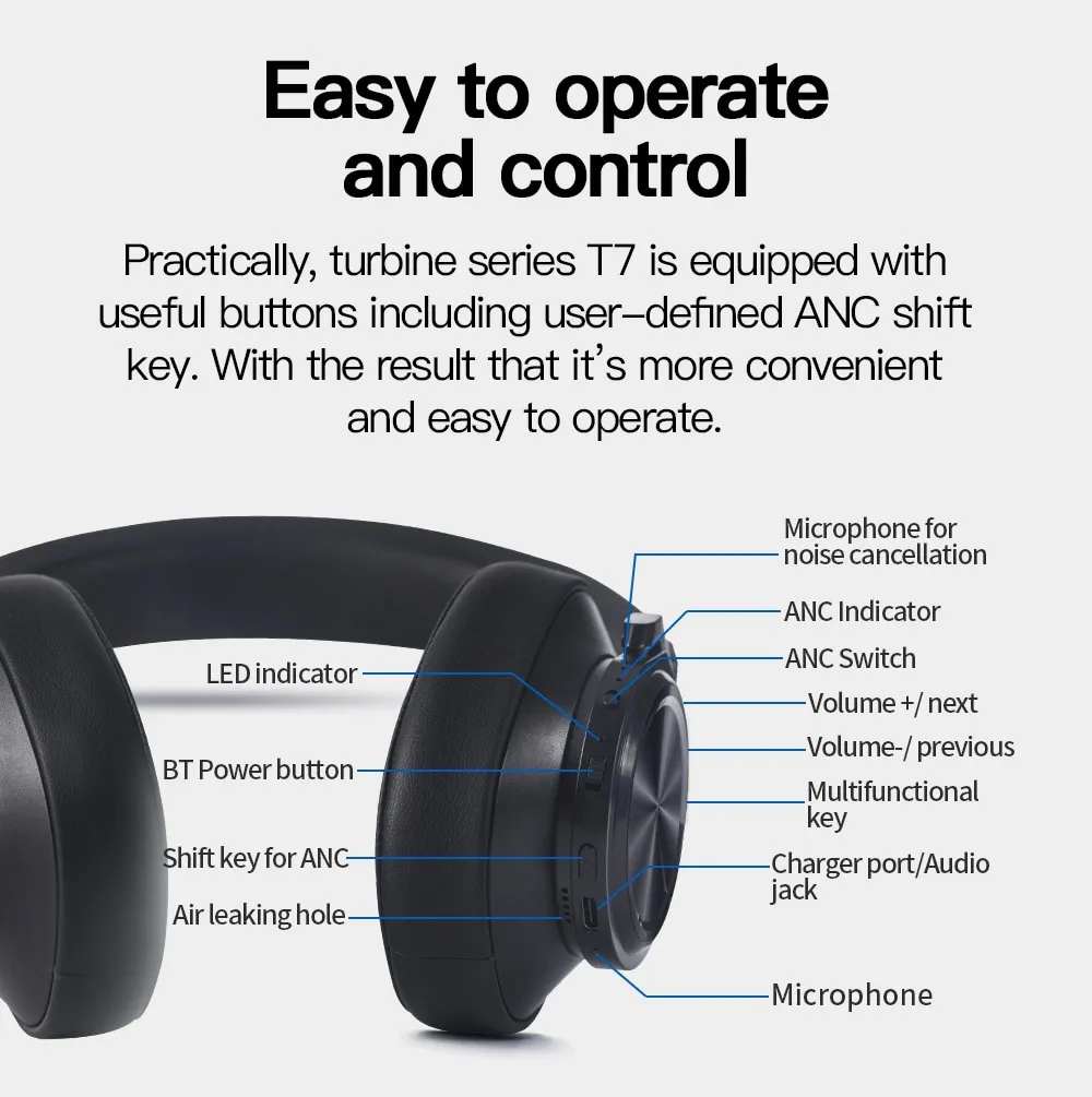 The T7 Bluetooth Headset features an ergonomic design that ensures comfort during long listening sessions. It is lightweight, with soft ear cushions that provide a snug yet comfortable fit. The adjustable headband ensures a customized fit, allowing you to wear it for hours without discomfort.
