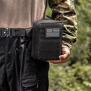 Built with tough, premium materials, our tactical medical pouch is wear, tear, and weather resistant. With a trifold design featuring spacious compartments, numerous pockets, and strong elastic loops, this EMT pouch keeps bandages, gauze pads, tapes, medicine, shears, and supplies organized and within easy reach