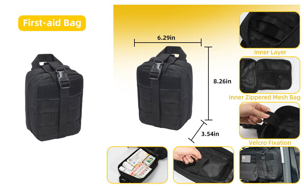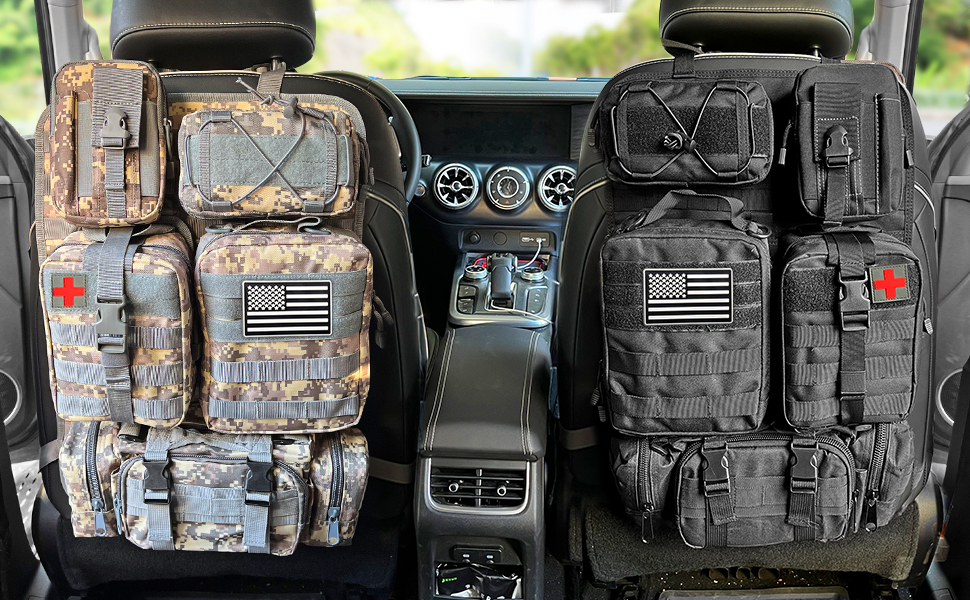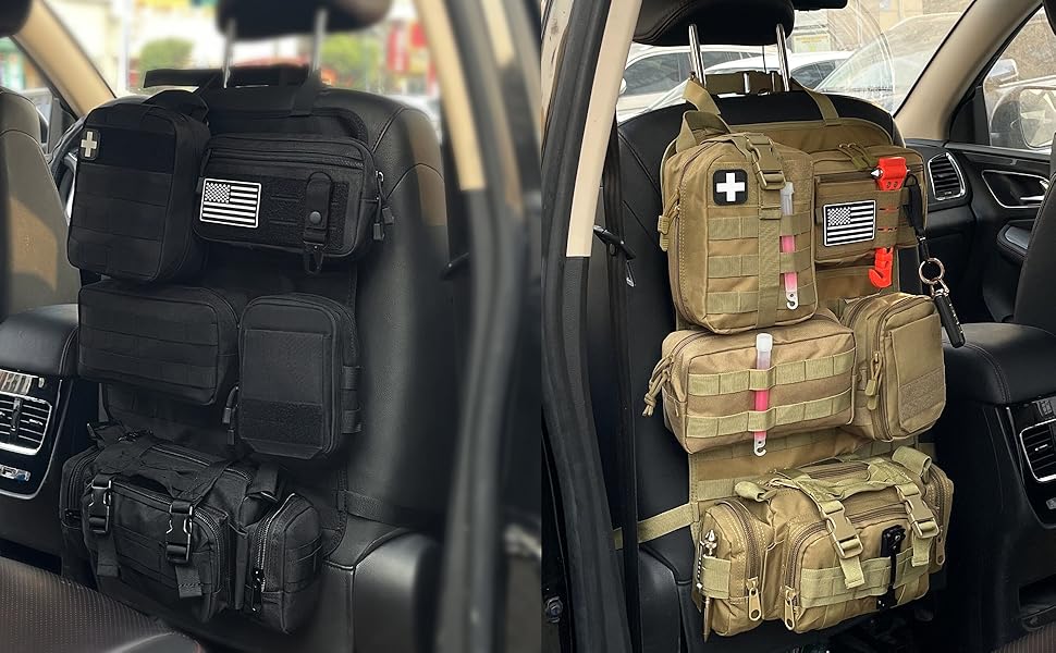 - 【Large Storage】Tactical molle seat back Organizer with 5 different types of molle bags provides ample storage space, can help you solve the storage problem of items of various sizes. Medical pouch holds your first aid supplies. Keeping your car clean and organized