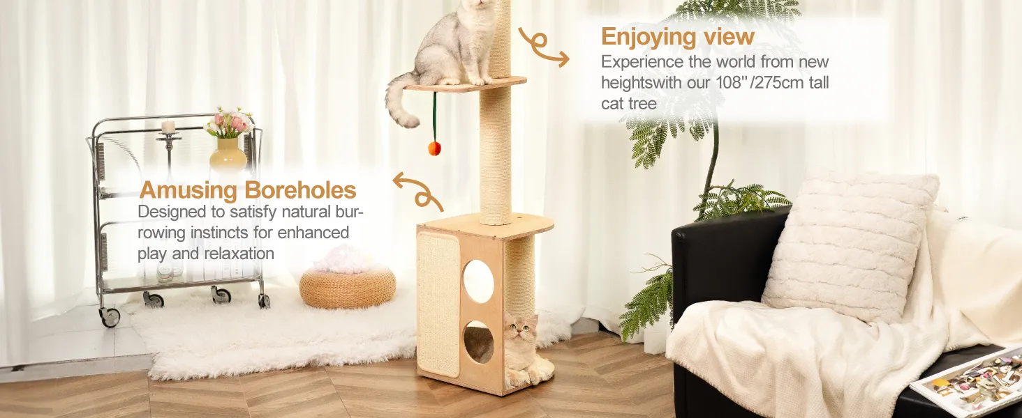 - Adjustable Floor to Ceiling Cat Tower: This cat tree maximizes vertical space, making it suitable even for compact areas. Its adjustable design accommodates ceilings up to 108 inches, satisfying cats' natural instincts to climb and perch high