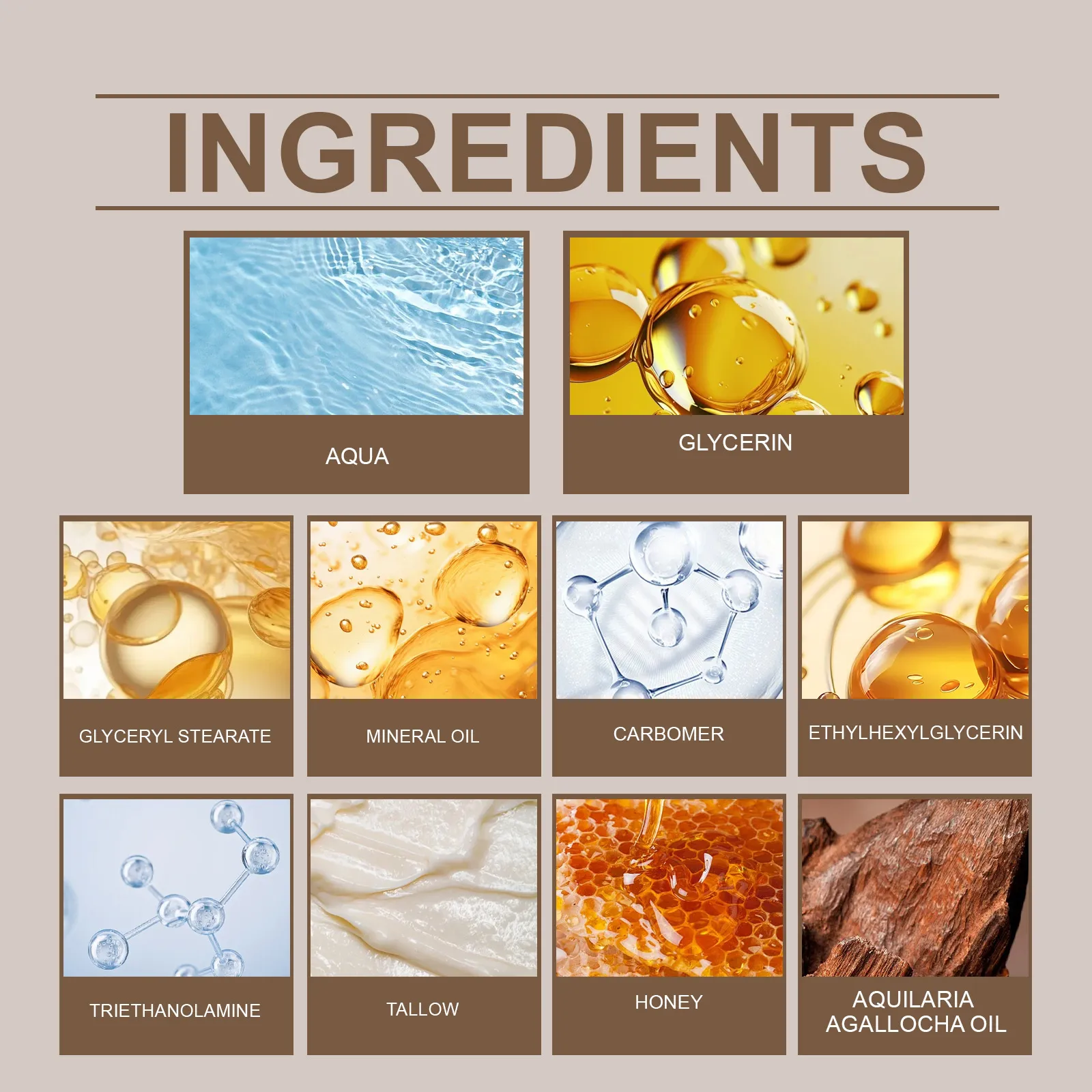 Ingredients: Water, glycerin, Glyceryl stearate, mineral oil, carbomer, ethylhexyl glycerol, triethanolamine, tallow, honey, Eaglewood oil